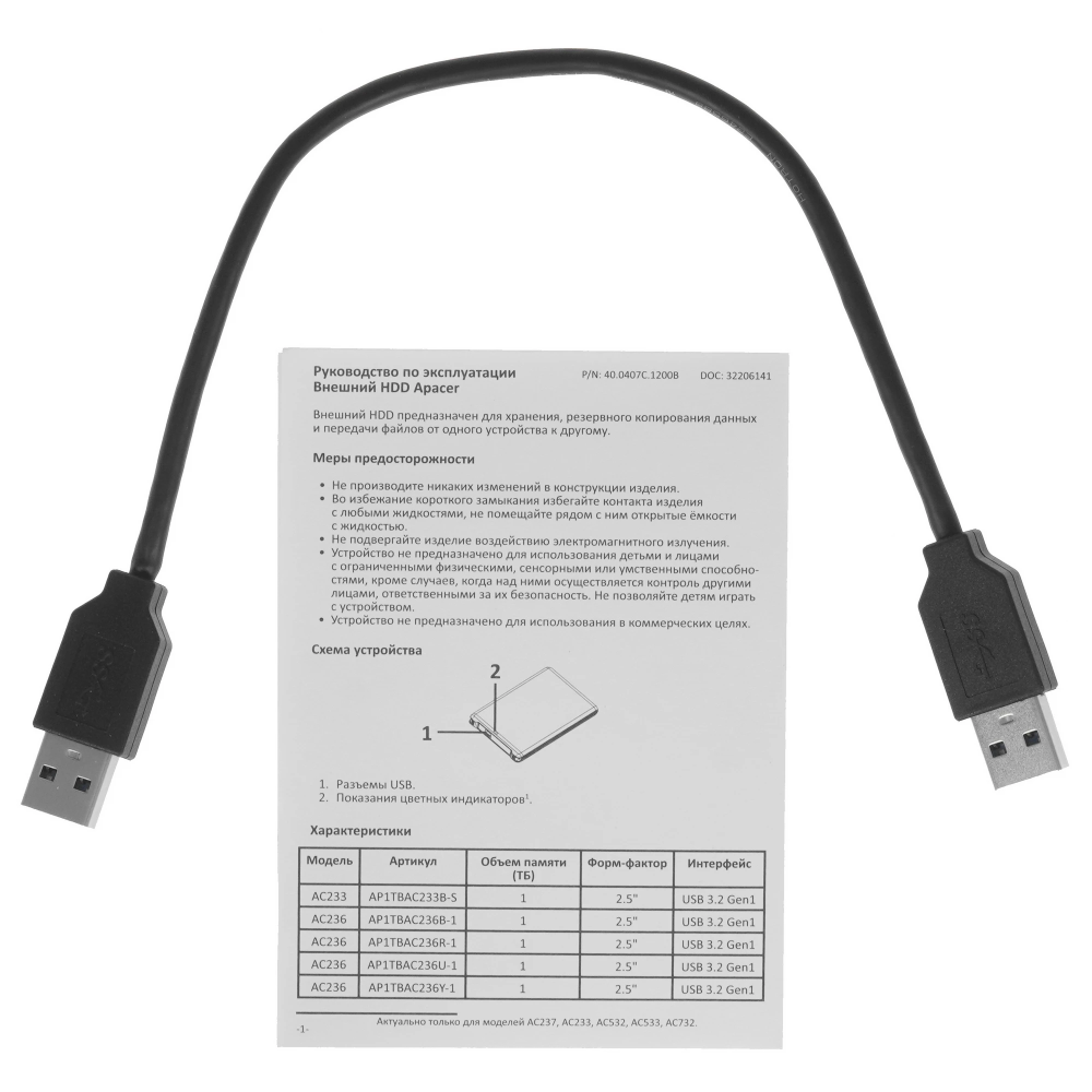 Внешний HDD Apacer AC236 обладает ярким, ультратонким корпусом из пластика красного цвета, благодаря чему помещается не только в сумку, но и в карман. Объем его памяти составляет 1 ТБ, что позволит хранить на диске коллекции музыки, фильмов и рабочие файлы. Интерфейс USB 3.2 Gen1 Type-A обеспечивает достаточно высокую пропускную способность (5 Гбит/с), поэтому чтение и запись информации происходит быстро. USB-разъем способен выдержать более 10000 подключений/отключений без снижения скорости передачи данных.