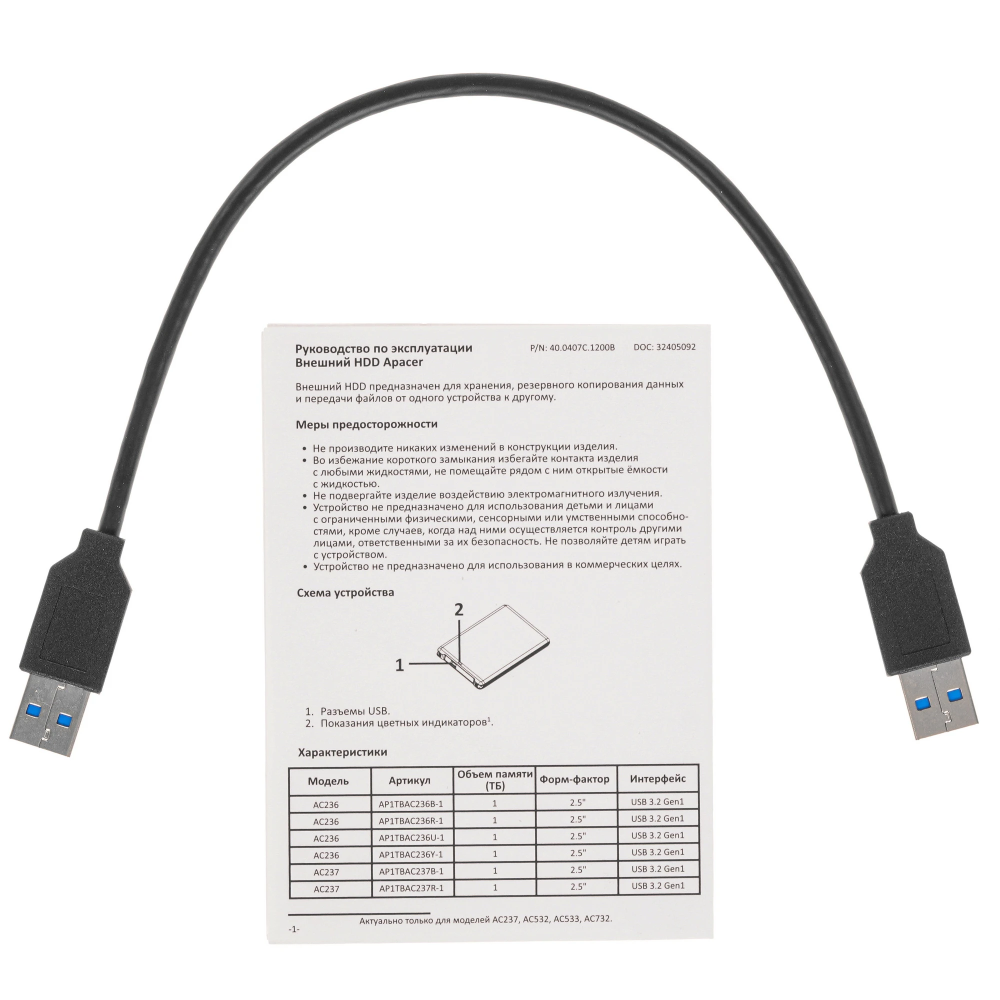 1 ТБ Внешний HDD Apacer AC237 (AP1TBAC237B-1) черного цвета объемом 1 Тб подойдет для хранения рабочих файлов, учебных материалов, семейных фотографий и видеозаписей. Интерфейс USB 3.2 Gen 1 Type-A передает данные между устройством и компьютером со скоростью 5 Гб/сек. Модель размером 2.5 дюйма является портативной. Ее можно взять с собой в поездку или на работу. Внешний HDD Apacer AC237 (AP1TBAC237B-1) питается от USB и может использоваться на ходу. Нет необходимости искать розетки.