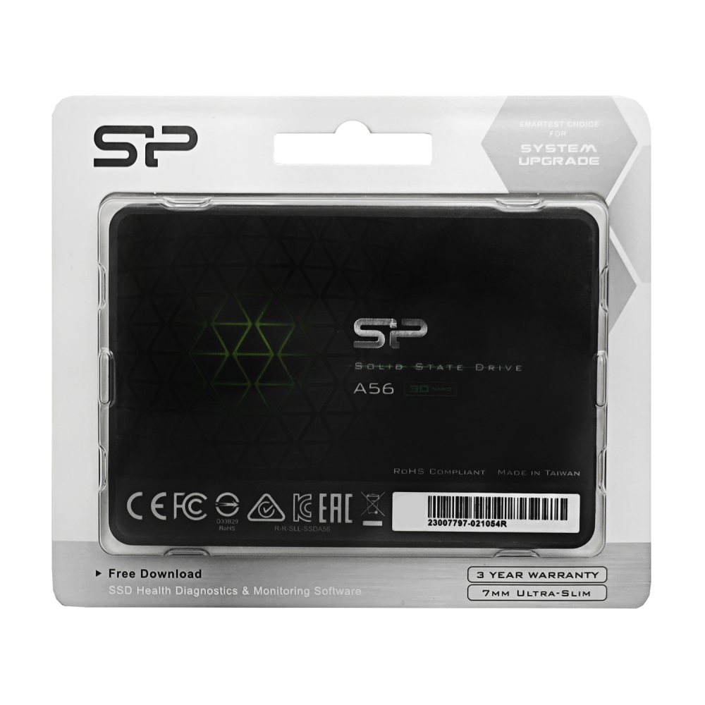Под хранение программ, документов, файлов мультимедиа предлагаются 2000 ГБ флэш-памяти со структурой 3D NAND. Скорость в режиме последовательного чтения 500 Мбайт/сек и 450 Мбайт/сек в режиме записи обеспечивает быстродействие обработки данных. Технология диагностики S.M.A.R.T. оценивает состояние накопителя. Механизм ECC обнаруживает и устраняет ошибки во время хранения и передачи данных. Утилита SP ToolBox предлагает средства для настройки производительности и мониторинга параметров. Накопитель Silicon Power Ace A56 подключается посредством интерфейса SATA III.