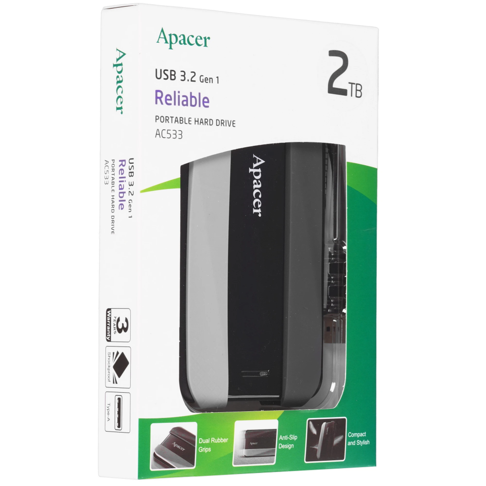 Внешний HDD Apacer AC533 объемом 2 ТБ станет надежным выбором в качестве портативного запоминающего устройства, которое можно носить с собой. Накопитель выполнен в пластиковом глянцевом корпусе с двумя съемными резиновыми лентами, защищающими жесткий диск от ударов. Накопитель оснащен скоростным портом USB 3.2 Gen 1 Type A и поставляется в комплекте с соответствующим интерфейсным кабелем.