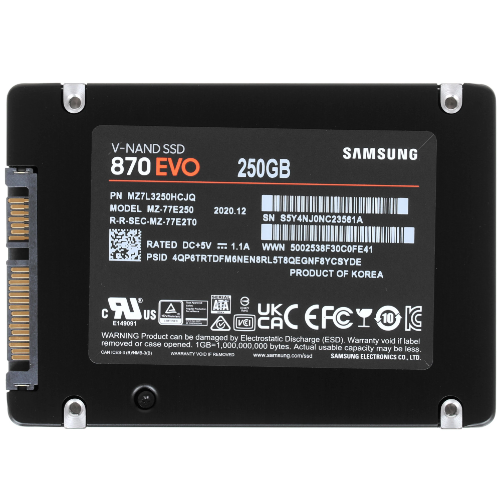 SSD-накопитель Samsung 870 EVO [MZ-77E250BW] выполнен в прочном корпусе, надежно защищающим компоненты от повреждений. Данная модель соответствует формату 2.5”, что обеспечивает простую установку как в системные блоки, так и в моноблоки и ноутбуки. При помощи отдельно приобретаемого бокса диск также может использоваться как внешнее устройство для работы с файлами.