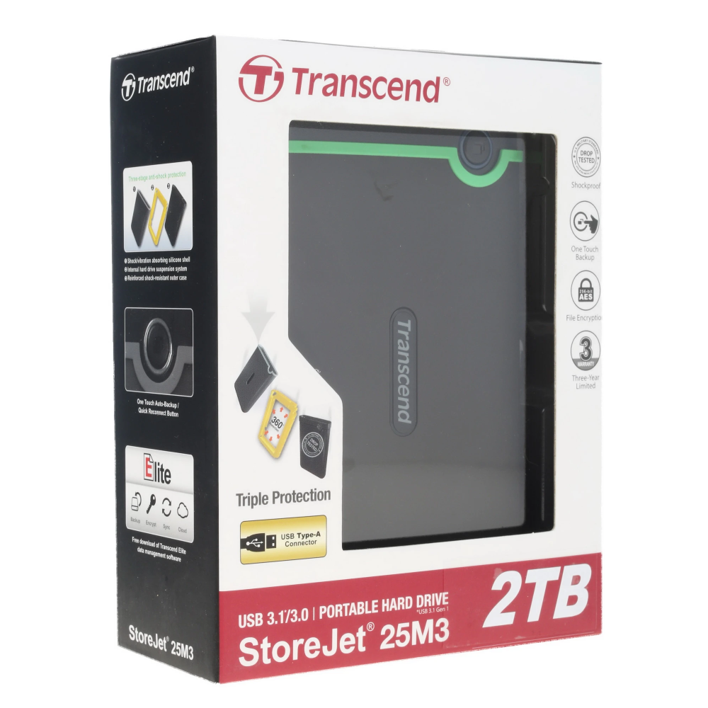 Внешний HDD Transcend StoreJet 25M3S соответствует армейскому стандарту защиты от ударов, то есть при падении с высоты 1.2 м он обеспечивает сохранность записанной на него информации. Это достигается за счет использования трехкомпонентной системы, включающей в себя прочный металлический корпус, внутренний демпфирующий подвес и внешний силиконовый чехол с прорезиненной поверхностью, препятствующей скольжению.