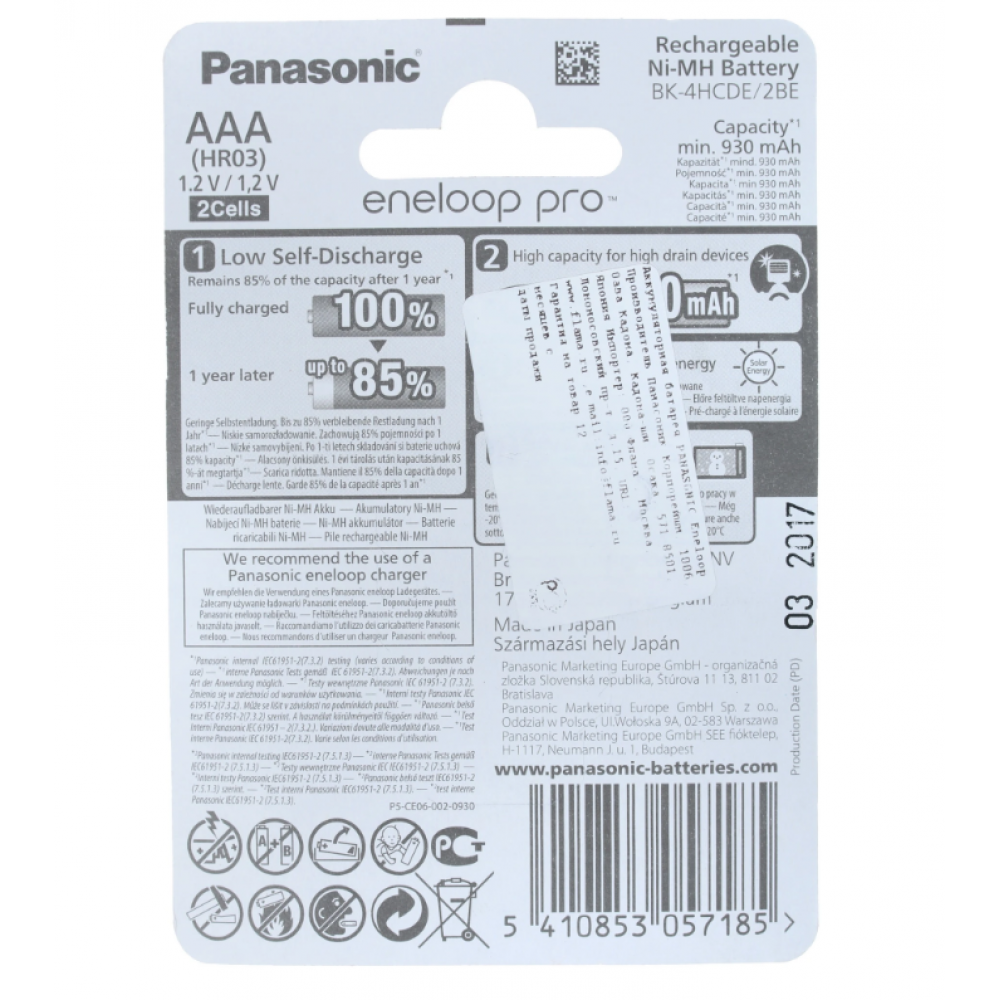 Качественные аккумуляторы Panasonic Eneloop Pro BK-4HCDE/2BE 930 мА·ч произведены очень известной компанией. Для изготовления этих элементов использовались только надежные компоненты, гарантирована их безопасность и соответствие действующим стандартам.