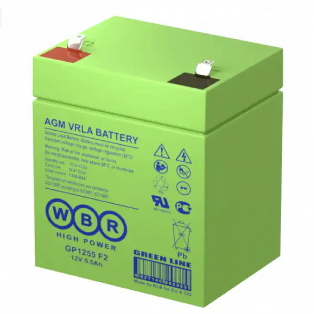 Аккумулятор WBR GP 1255 с напряжением 12 В и ёмкостью 5.5 Ач предназначен для общего применения и использует технологию AGM (стекловолоконные сепараторы, пропитанные электролитом). Его срок службы составляет 8 лет в буферном режиме и 260 циклов при 100% глубине разряда. Долговечный корпус из ABS-пластика полностью герметичен, а значит аккумулятор WBR GP 1255 можно использовать в любом положении.