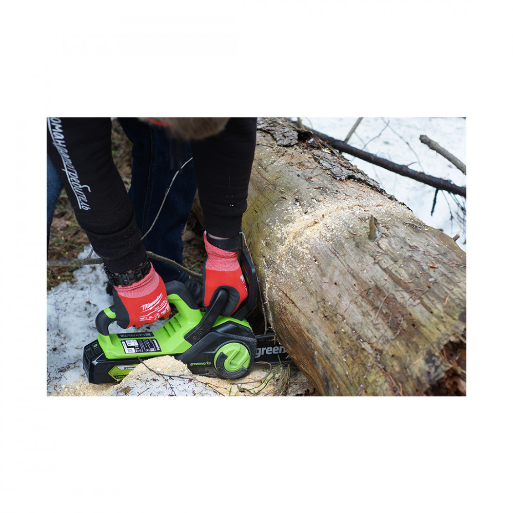 За счет компактных размеров и легкого веса 2,6 кг, пилу можно брать с собой в дорогу. Бесключевая система фиксации позволяет устанавливать и подтягивать цепь без специальных инструментов. Благодаря прорезиненной рукоятке и эргономичному дизайну пила будет отлично сидеть в руке и меньше уставать при продолжительной работе. Инструмент оснащен автоматической смазкой цепи, тем самым срок службы шины и цепи будет дольше. Прозрачный масляный бачок позволяет значительно проще контролировать уровень масла. Поскольку двигатель пилы электрический, то для работы с устройством не требуется готовить масляно-бензиновую смесь, а также не нужно заменять свечи и фильтры. Электропила не загрязняет воздух, издает меньше шума и вибраций. Для безопасности пила оснащена кнопкой-предохранителем от случайного включения и щитком для защиты рук.