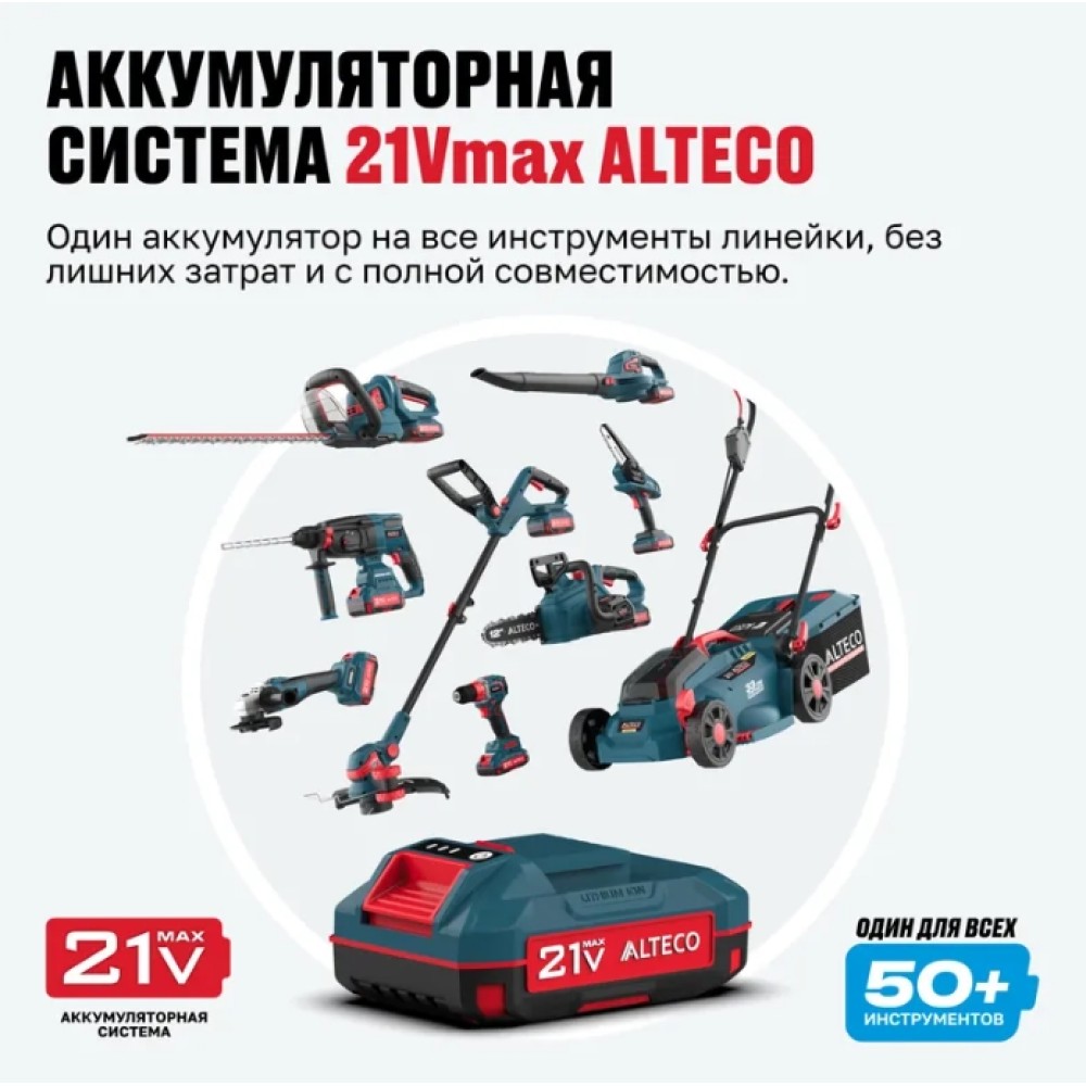 Разработан для аккумуляторной системы 21Vmax ALTECO — совместим со всеми аккумуляторами серии, обеспечивая универсальность.