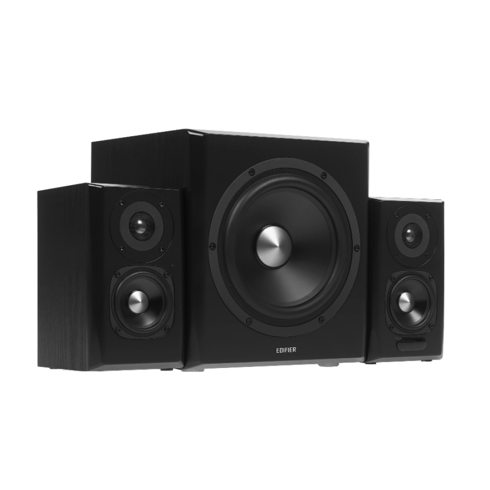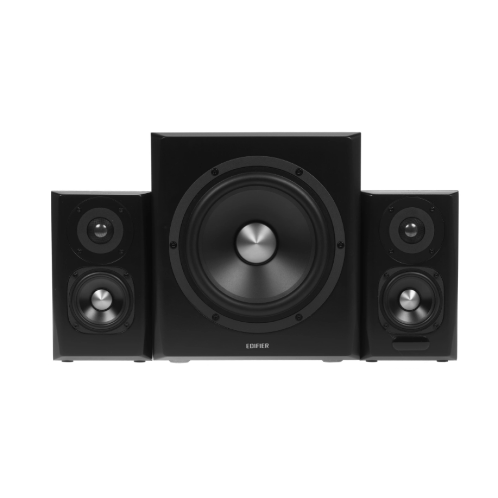 Двухполосные колонки комплекта оснащены титановыми дюймовыми твиттерами и 3.5-дюймовыми среднечастотниками. Басовую линию в Edifier S351DB ведёт не только сабвуфер, но и сателлиты. Для этого им на заднюю сторону врезали фазоинвертор, который подключается примерно со 100 Гц. По части подключений модель вооружили двумя RCA-входами, цифровыми интерфейсами для оптики и коаксиального кабеля, а также модулем беспроводной связи Bluetooth 4.0 с поддержкой AptX (на колонки можно транслировать несжатый поток со смартфона). Для удалённого управления мультимедийной системой 2.1 используется удобный пульт ДУ. В придачу ручки тонкой подстройки частот вынесены на боковую грань корпуса одного из сателлитов. Весит комплект в полном сборе свыше 17 кг.
