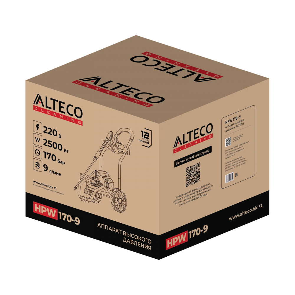 Аппарат высокого давления ALTECO HPW 170-9 - может осуществлять работы по очистке загрязненных областей. Аппарат работает по принципу подачи струи воды под высоким давлением. Преимуществом данного аппарата является наличие систем полной остановки и самовосстанавливающейся термической защиты. Благодаря легкой конструкции и наличию колес аппарат удобен в транспортировке. Также аппарат имеет быстросменные сопла.