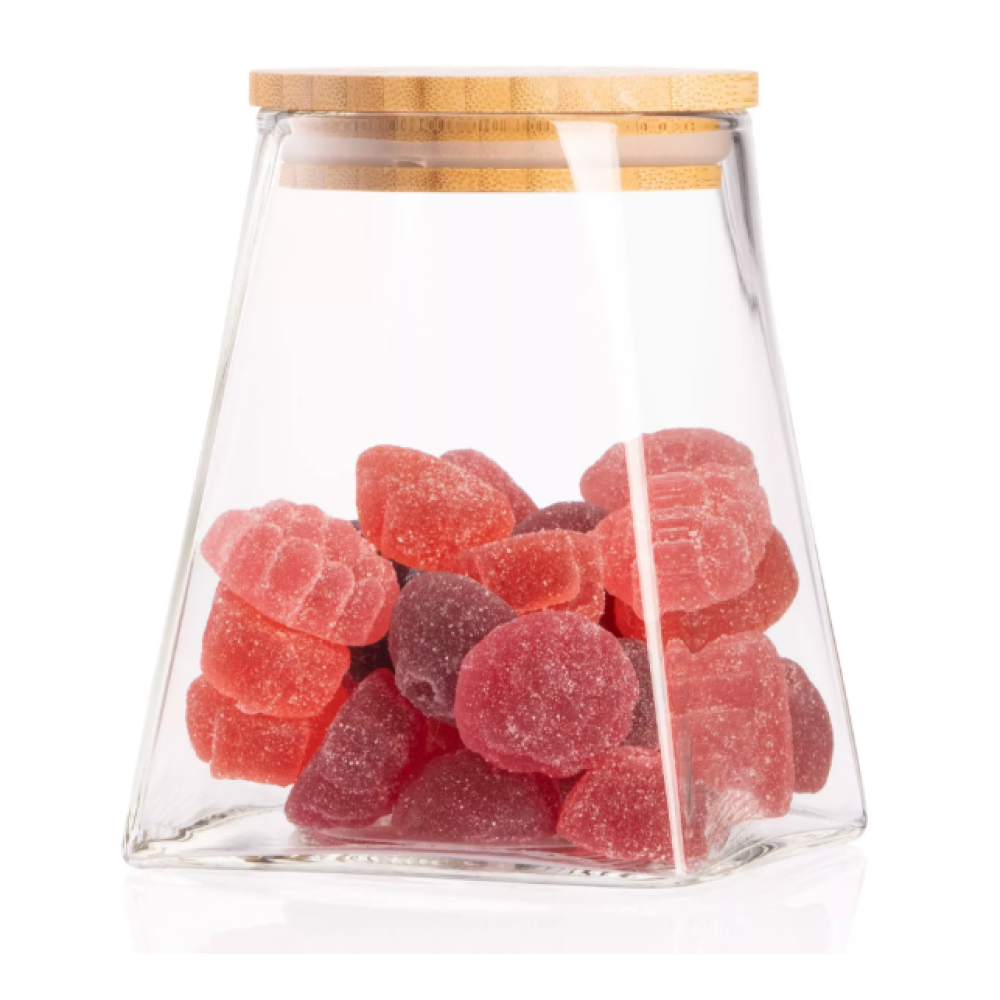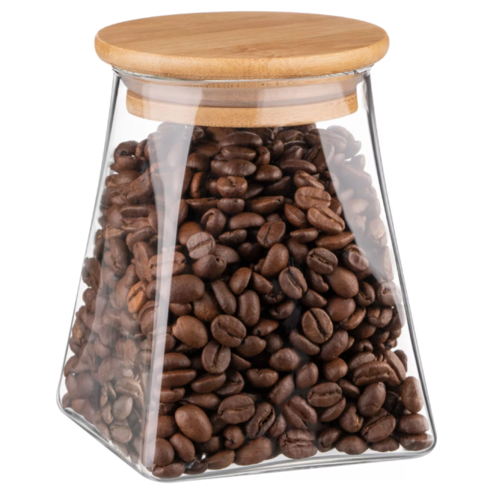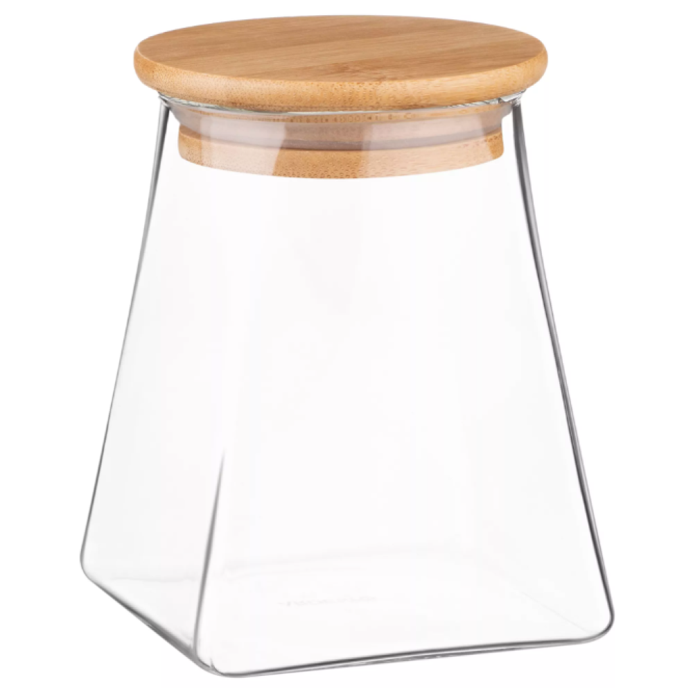 Прозрачная банка для хранения из боросиликатного стекла имеет конусную форму и объем 510 мл. Оснащена плотной бамбуковой крышкой. Высота – 12 см. Можно мыть в посудомоечной машине.