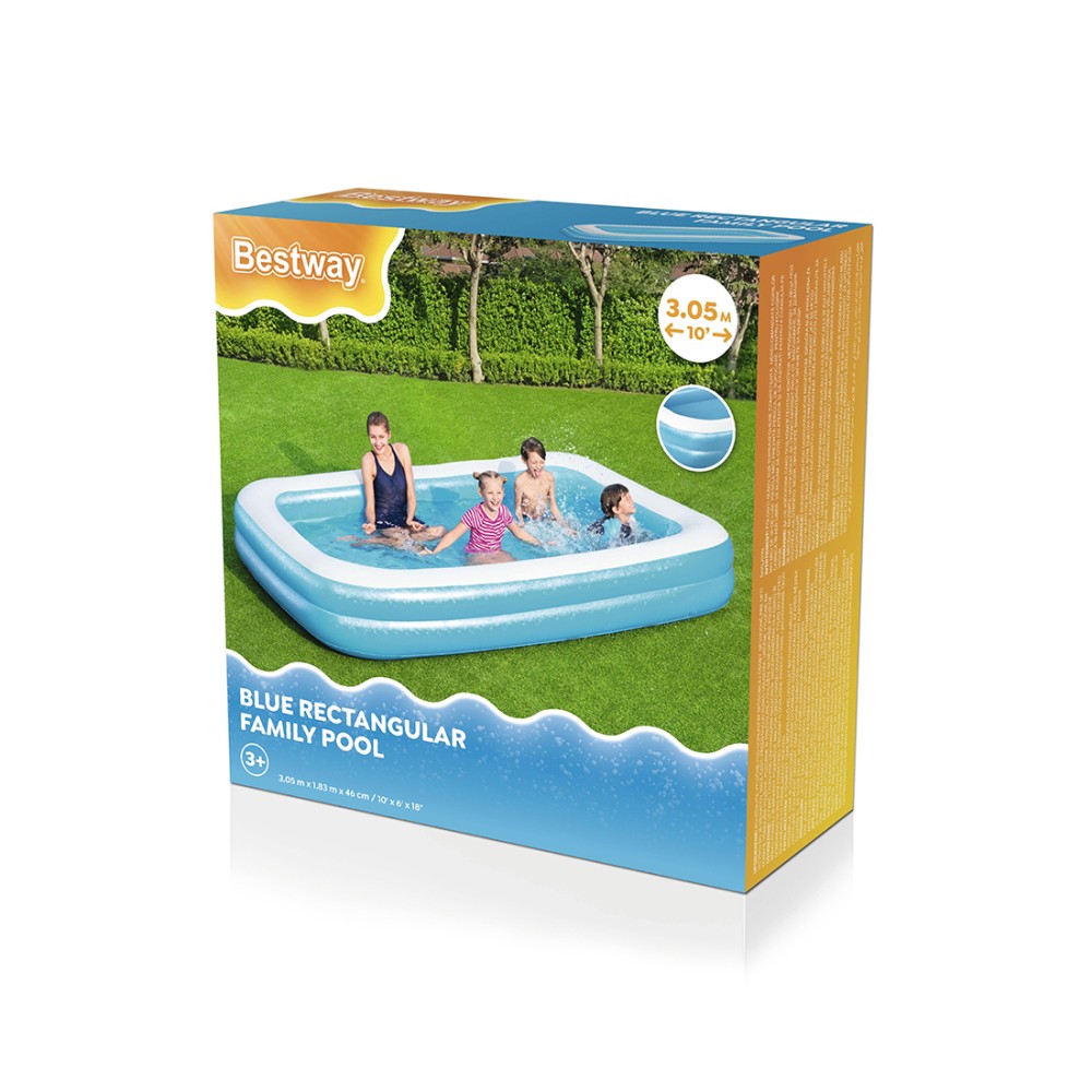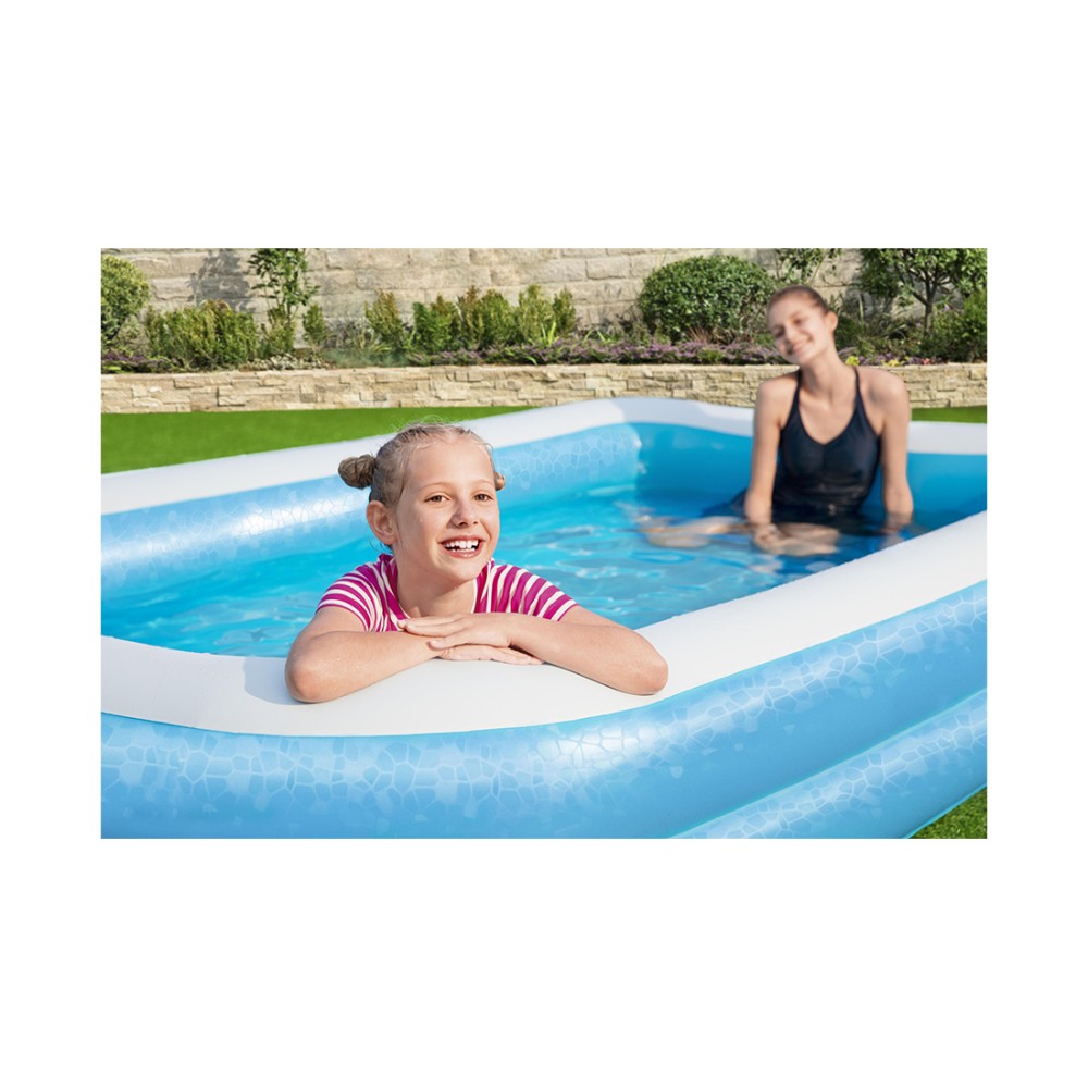 Прямоугольный семейный надувной бассейн Bestway для взрослых и детей от 3 лет. Изготовлен из высококачественного винила, устойчивый, надежный и безопасный. Имеет мягкие стенки с широкими бортиками и жесткое дно из винила.