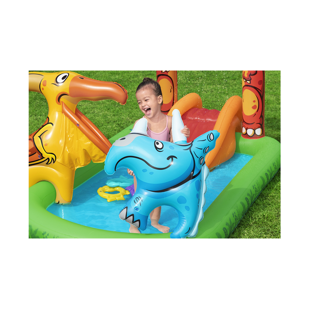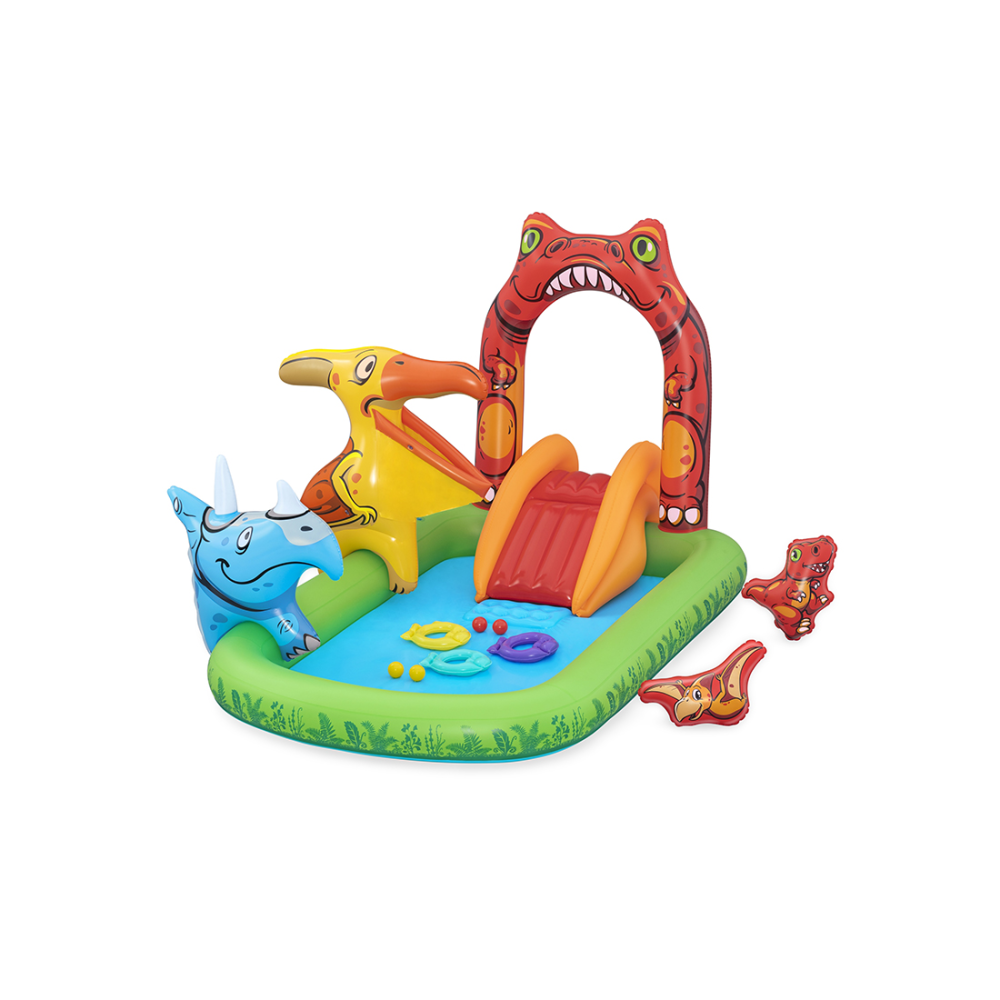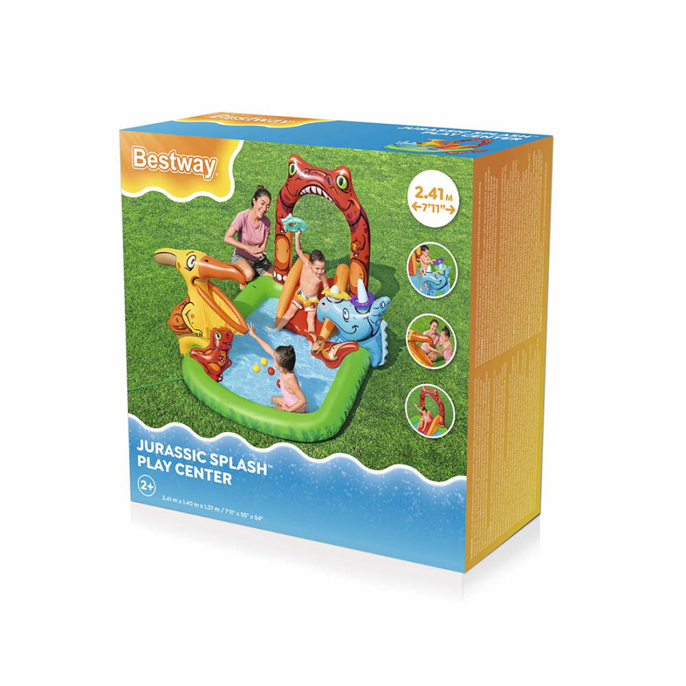 Сделайте это лето незабываемым с игровым центром Bestway Jurassic Splash! Вашим детям понравится плескаться и скользить под арочным водопадом-тиранозавром в лагуну с динозаврами. А еще они могут бросать мячики в открытый рот птеранодона; для этой цели в комплект входят 4 игровых мячика. Дети также могут метать 3 кольца в форме рыбок на трицератопса, чтобы зацепить их за его рог. И если это окажется слишком легким заданием для них, то надувного динозавра можно переместить вдоль игрового центра для увеличения сложности игры. Этот игровой центр также можно использовать в помещении без воды в холодные или пасмурные дни. Таким образом, независимо от того, установите ли вы его на заднем дворе или перед домом, либо в помещении в холодную погоду, ваши дети будут часами забавляться в игровом центре Bestway Dino Splash!
