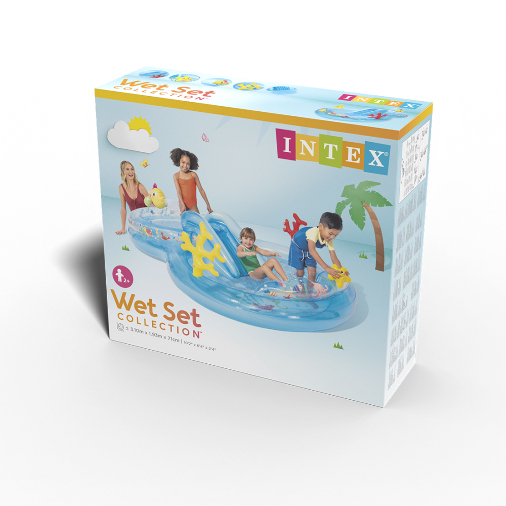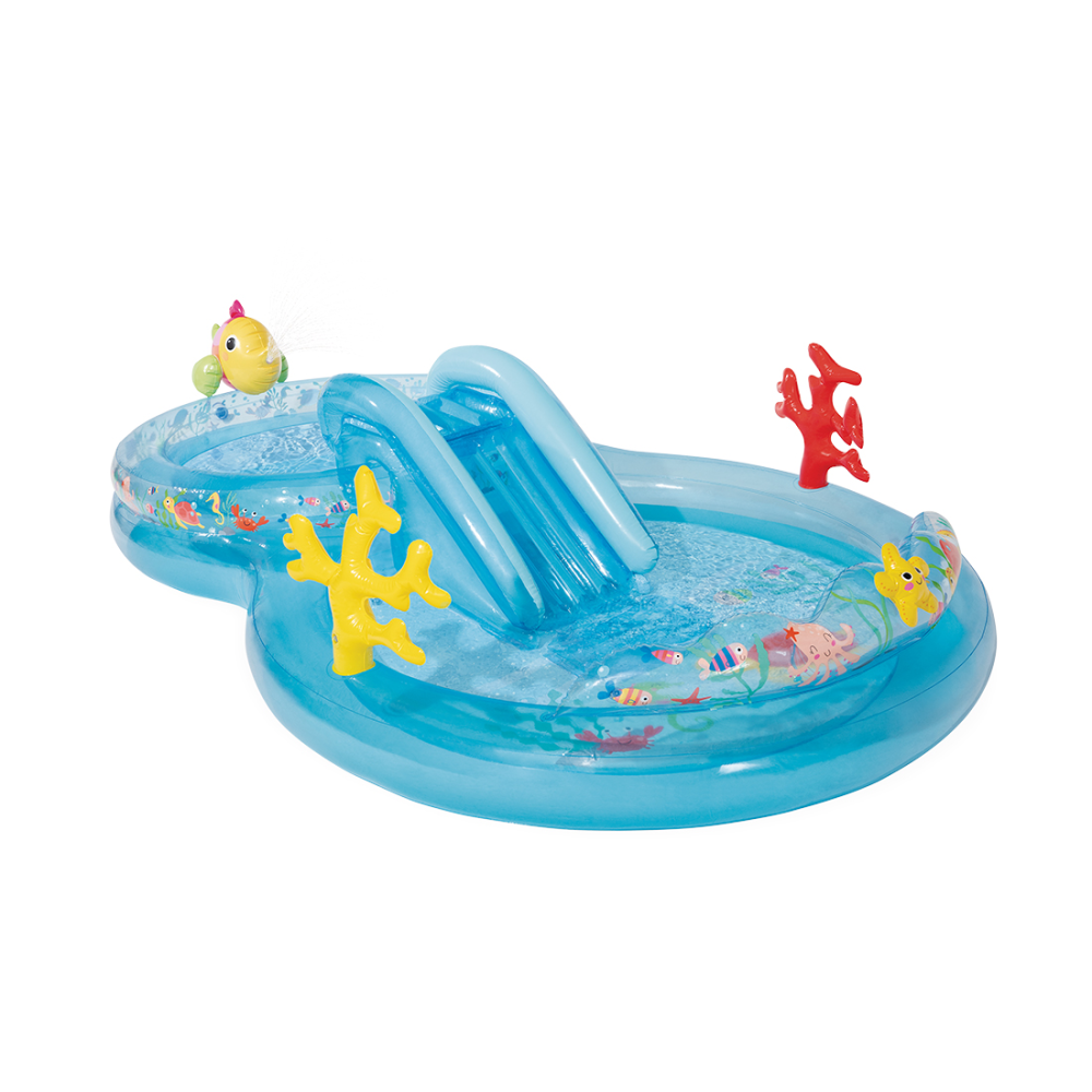 Игровой центр включает в себя малый и большой отдел для купания, водную горку, по которой можно скатываться в бассейн, распылитель воды, подсоединяющийся к садовому шлангу, игрушки, коврик для приземления.