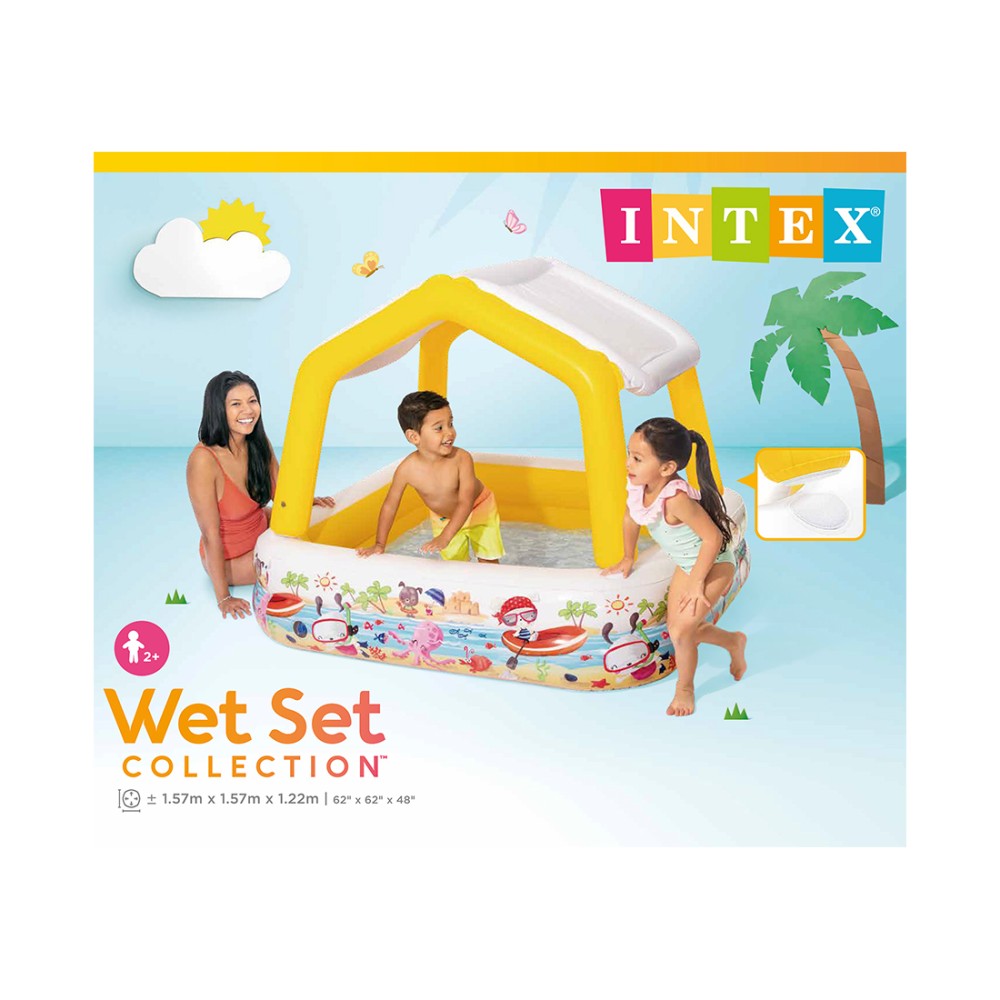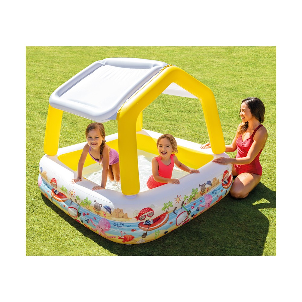Детский надувной бассейн Sun Shade Intex 57470 - отличный надувной бассейн, который предназначен для купания и веселых игр в воде под открытым небом. Данная модель оборудована специальным съемным навесом, который надежно защищает от воздействия прямых солнечных лучей. Бассейн можно очень легко и быстро надуть и использовать без применения каких-либо специальных средств. Очень удобен, можно брать с собой в дорогу. Изготовлен из прочных и высококачественных материалов, что гарантирует долгий срок службы.