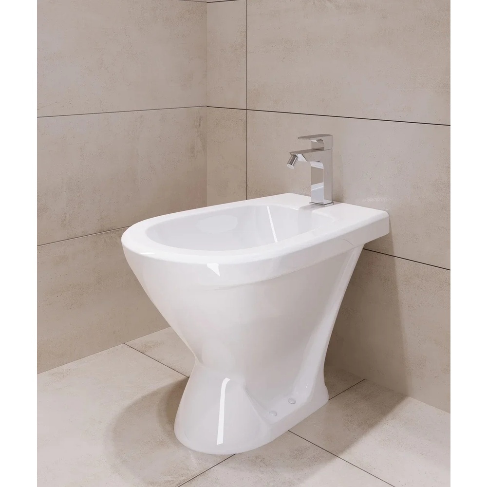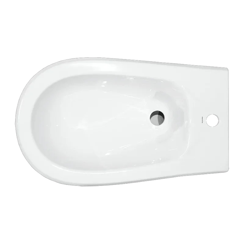 Напольное биде из санфарфора белого цвета. Имеет овальную форму, горизонтальный/вертикальный выпуск и одно отверстие под смеситель. Оснащено донным клапаном (приобретается отдельно). Производитель — Россия. Коллекция Самарский