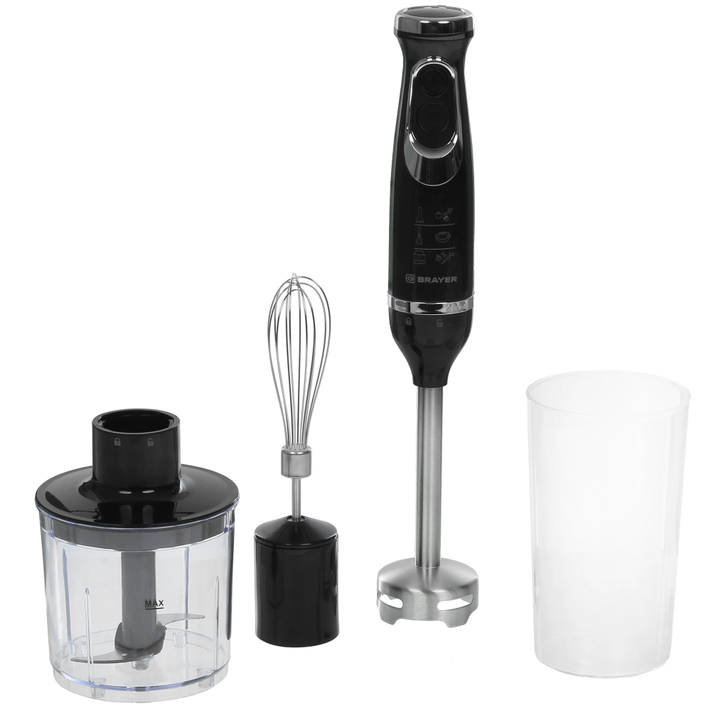 Блендер BRAYER BR1240 – универсальный и функциональный прибор, который станет востребованным помощником в повседневном приготовлении различной пищи. С его помощью вы сможете выполнять измельчение, смешивание или взбивание в однородную массу различных продуктов. Два скоростных режима и режим «Турбо» обеспечивают настройку необходимой скорости. В наборе поставляются погружная часть с острыми лезвиями, компактный измельчитель емкостью 350 мл, венчик и мерный стакан на 700 мл. Ручка эргономичной формы с кнопками гарантирует комфортное удержание и управление блендером BRAYER BR1240.