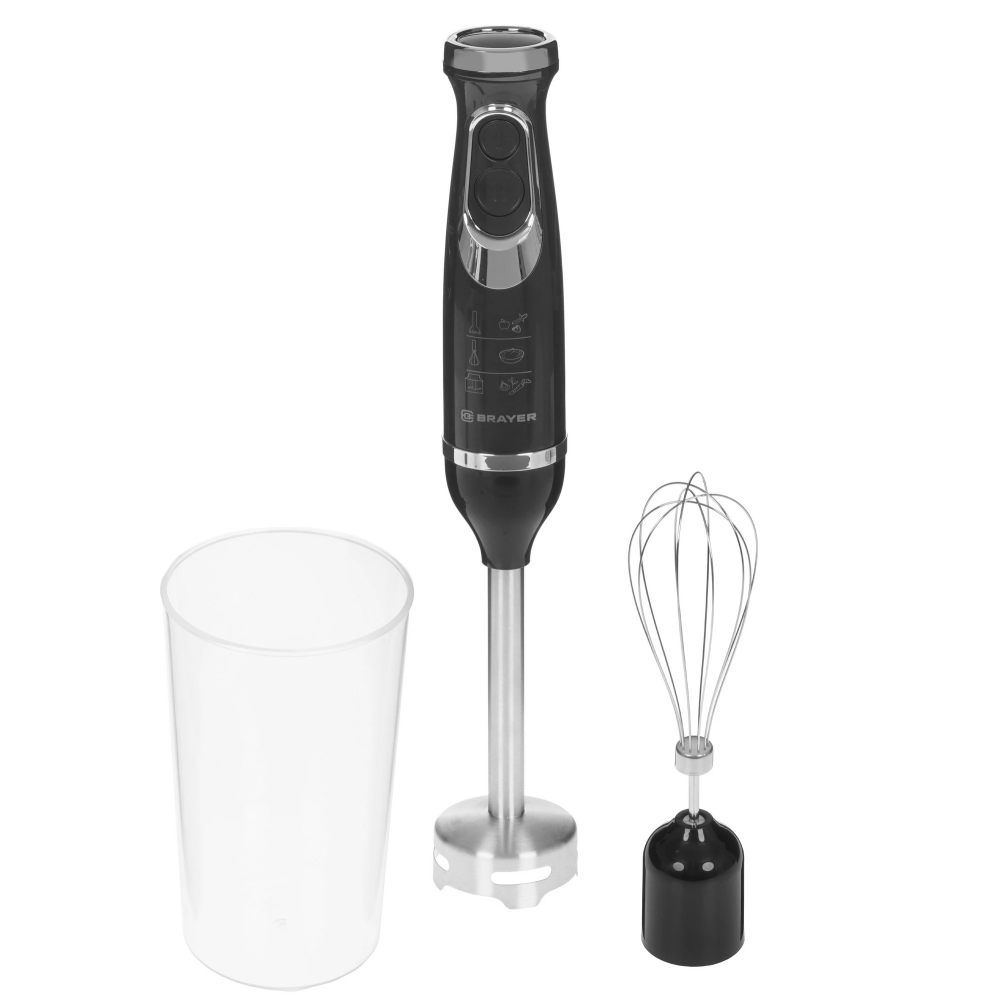 Модель BRAYER BR1241 поставляется с удобным мерным стаканом на 700 мл, венчиком для взбивания и насадкой-блендером. Устройство дополнено системами защиты от перегрева и перегрузки. Прибор весит 1 кг, обладает размерами 13x23x20 см и дополняется кабелем длиной 75 см.