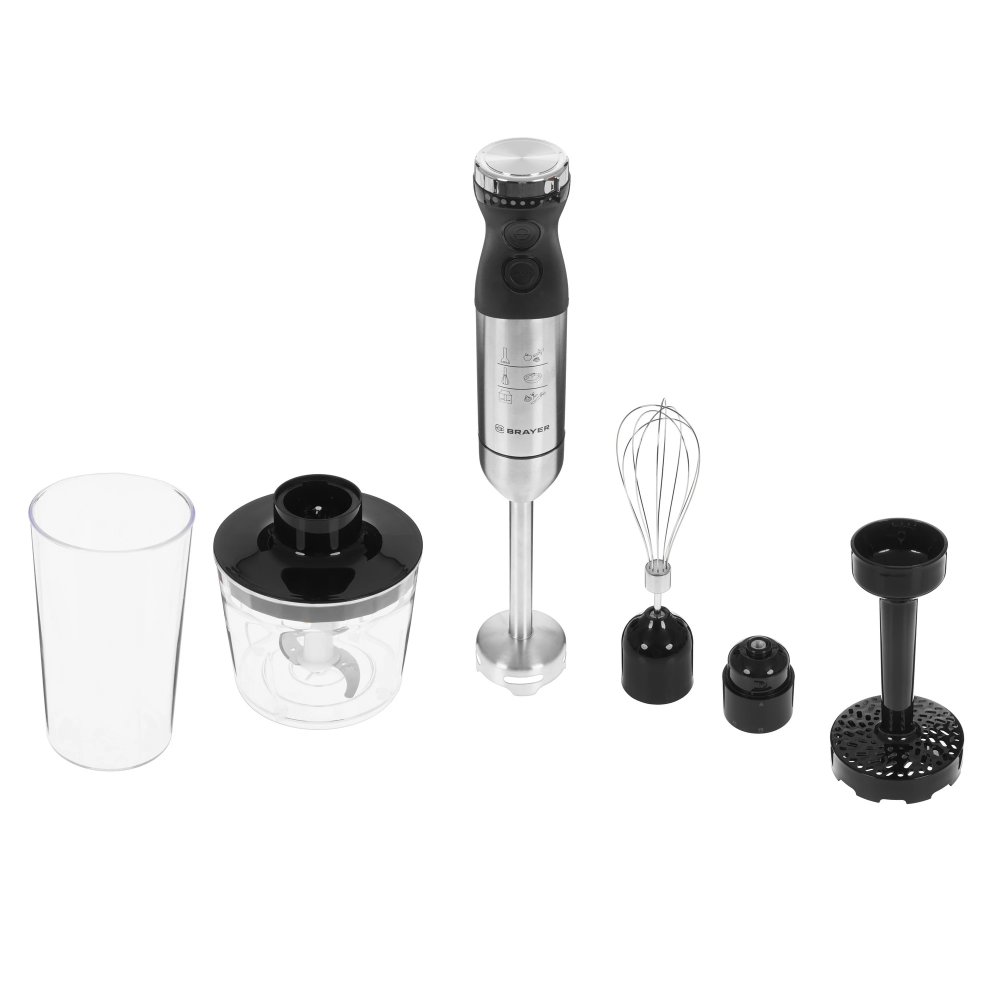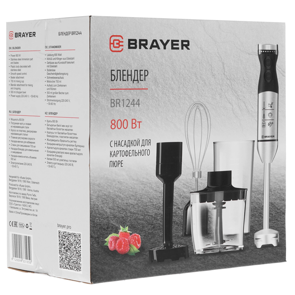 Прибор BRAYER BR1244 поставляется с мерным стаканом, измельчителем с емкостью на 500 мл, насадками в виде блендера, для взбивания и приготовления картофельного пюре. Устройство весит 2 кг и обладает размерами 20x30x20 см. С помощью блендера проводить кулинарные эксперименты проще и удобнее.