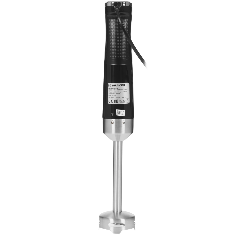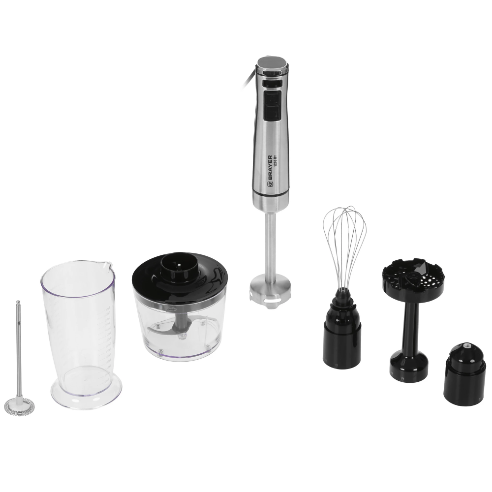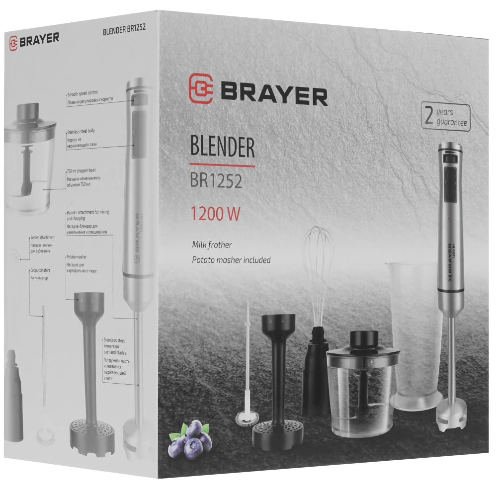В комплекте к блендеру BRAYER BR1252 прилагается мерный стакан объемом 700 мл и капучинатор для кофе. Питается устройство от сети с помощью кабеля, а время его непрерывной работы составляет 1-2 минуты.