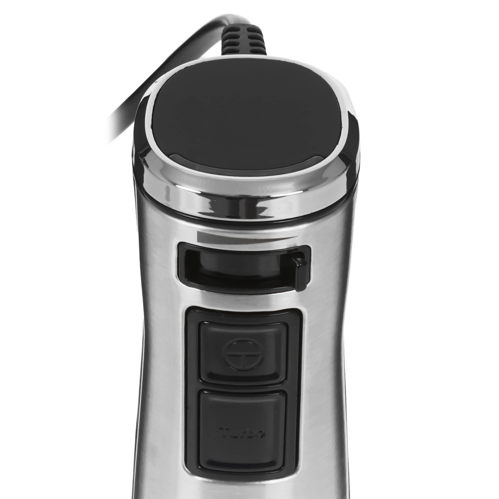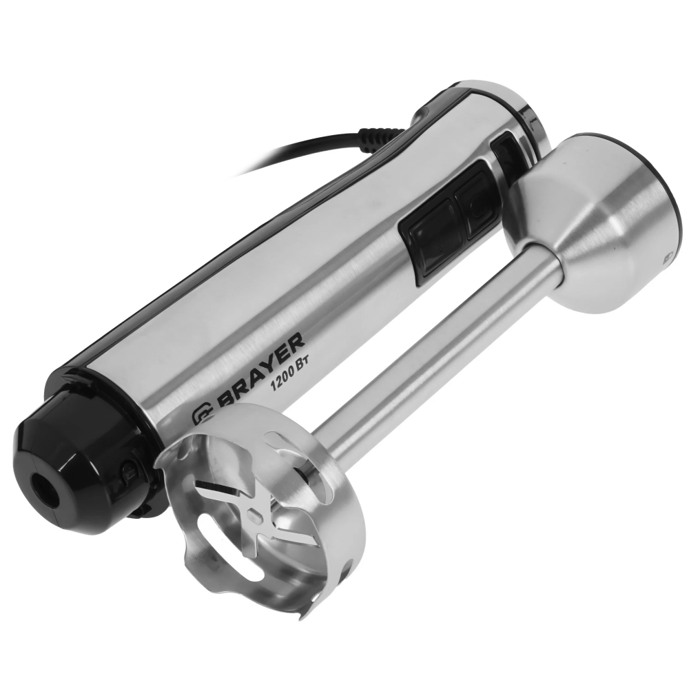 Серебристый погружной блендер BRAYER BR1252 оснащен 5 насадками для измельчения, смешивания твердой и жидкой пищи. Дополнительно есть режим приготовления картофельного пюре и взбивания пенки из молока или сливок с помощью венчика. Если включить встроенный турборежим, устройство будет работать с максимальной мощностью 1200 Вт и предельной скоростью вращения, что особенно полезно, если вам нужно добиться единой массы без комков.