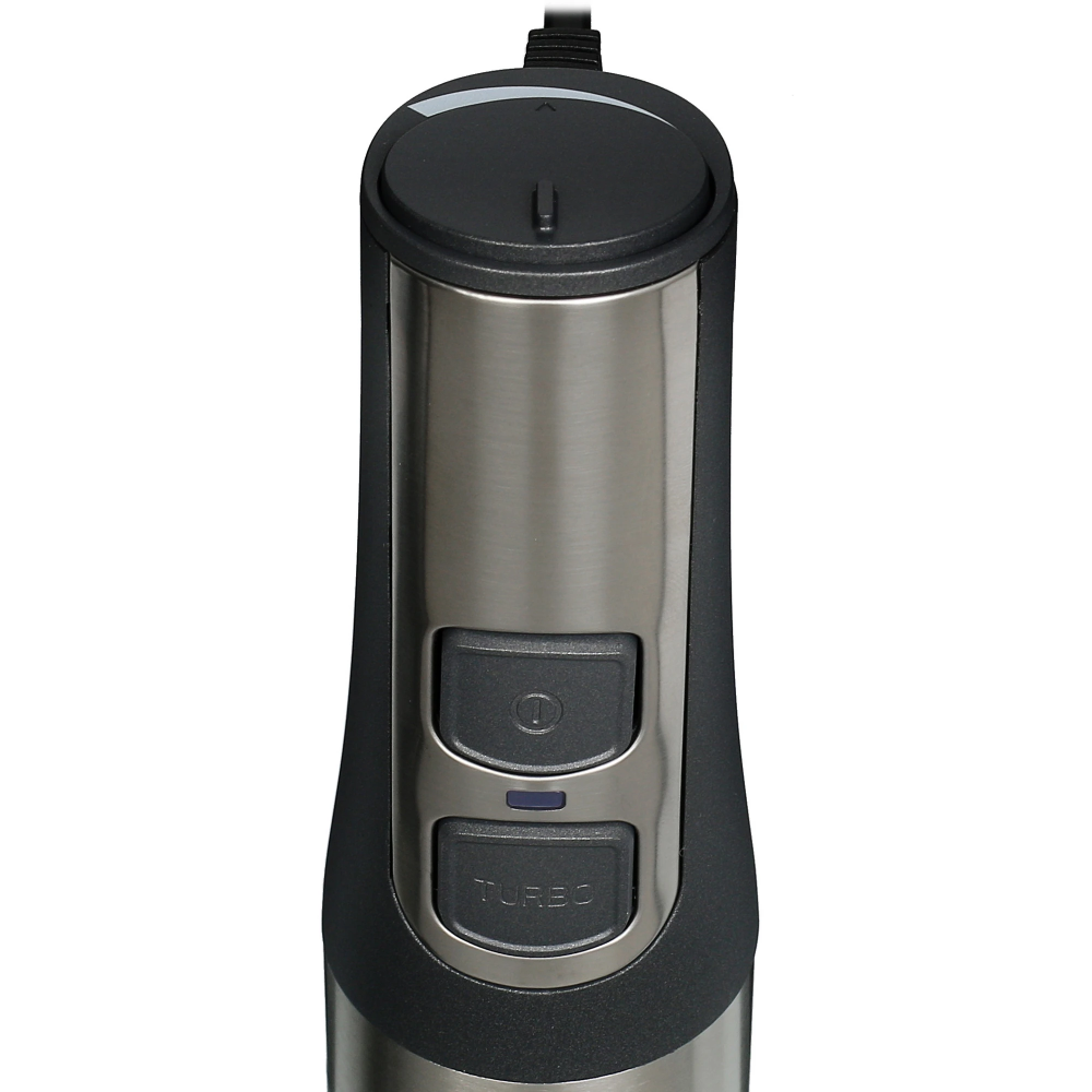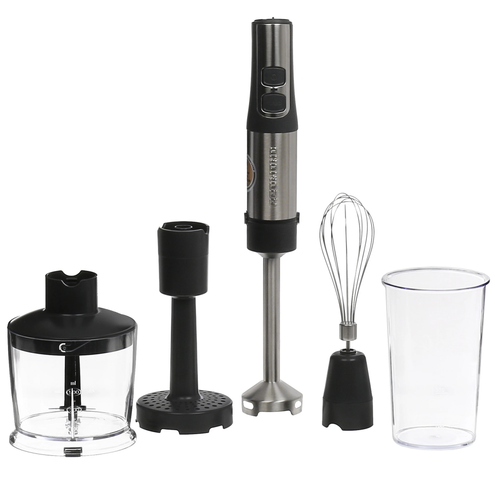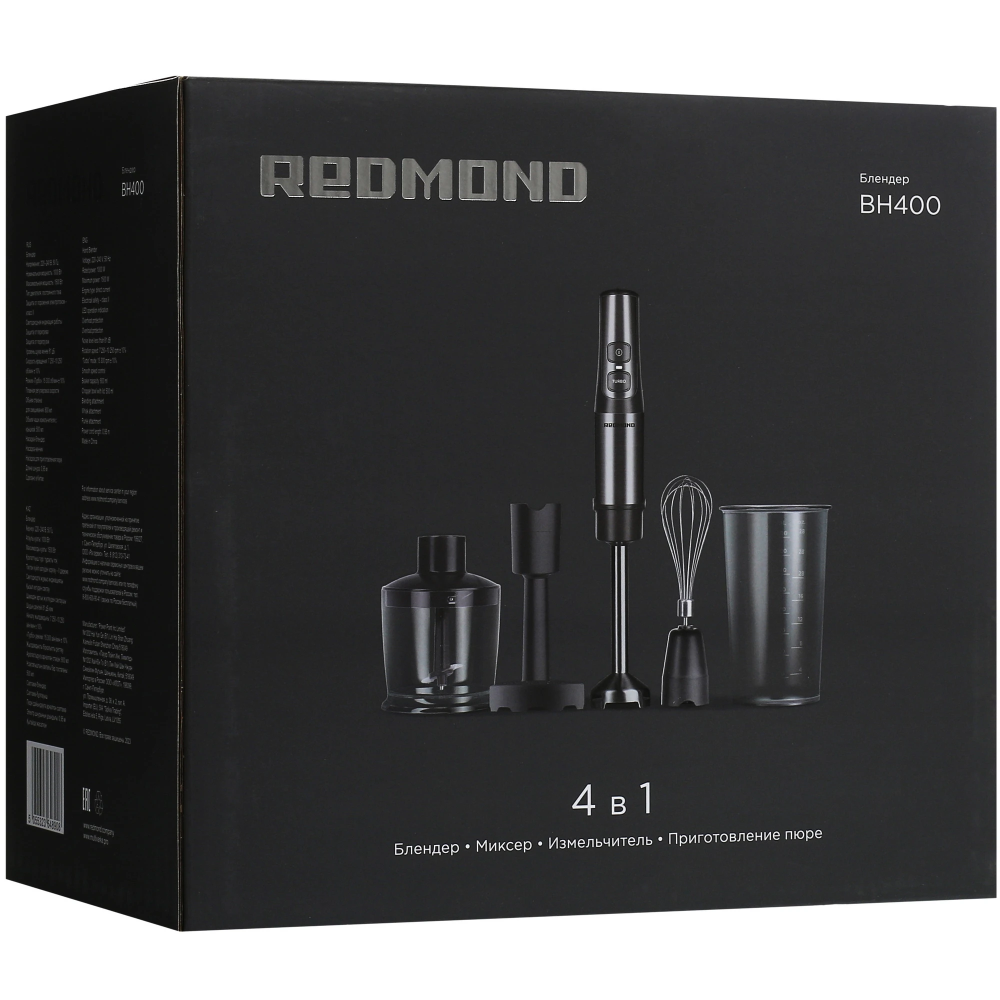 Блендер Redmond BH-400 комплектуется 4 насадками, в том числе для приготовления пюре. Мощность 1500 Вт позволяет устройству быстро справляться с поставленными задачами. Используя мерный стакан объемом 0.8 л, хозяйки не ошибутся с количеством ингредиентов. Активация турборежима и регулировка скоростей осуществляется при помощи кнопок, а также поворотного переключателя.