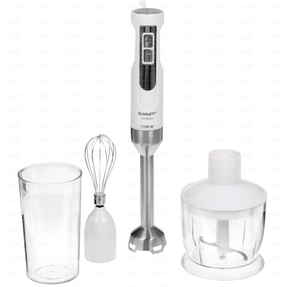 Погружной блендер Scarlett SC-HB42F09 - универсальный кухонный прибор. В комплекте идут насадки для смешивания, измельчения, взбивания, а также мерный стакан.