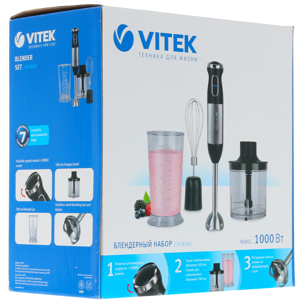 Блендер Vitek VT-8540 в черно-серебристом корпусе из пластика имеет мощность 1000 Вт и плавную регулировку скорости. Прибор позволяет своему владельцу справляться с самыми сложными кулинарными задачами благодаря наличию ножа-измельчителя, венчика и насадки-блендера. Турборежим форсирует работу устройства, благодаря чему оно может справляться с жесткими продуктами. Последнее так же возможно благодаря тому, что погружная часть прибора выполнена из металла. Емкость измельчителя рассчитана на 0.5 л. Длина провода блендера Vitek VT-8540 составляет 1.1 м.