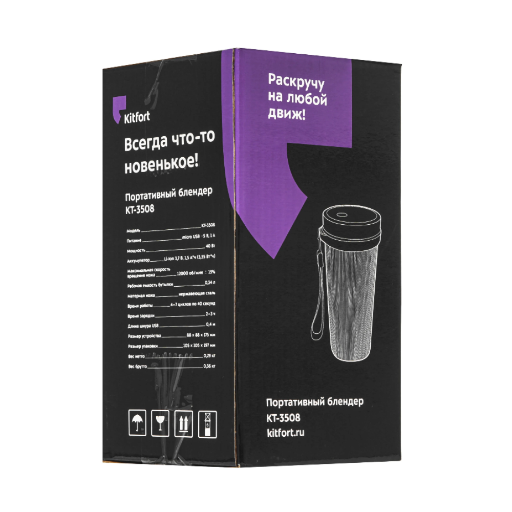 Благодаря компактному размеру, блендер Kitfort КТ-3508 можно использовать в любом месте: на работе, в спортивном зале, в машине или на пикнике – у вас всегда будет возможность приготовить здоровый и вкусный коктейль.4