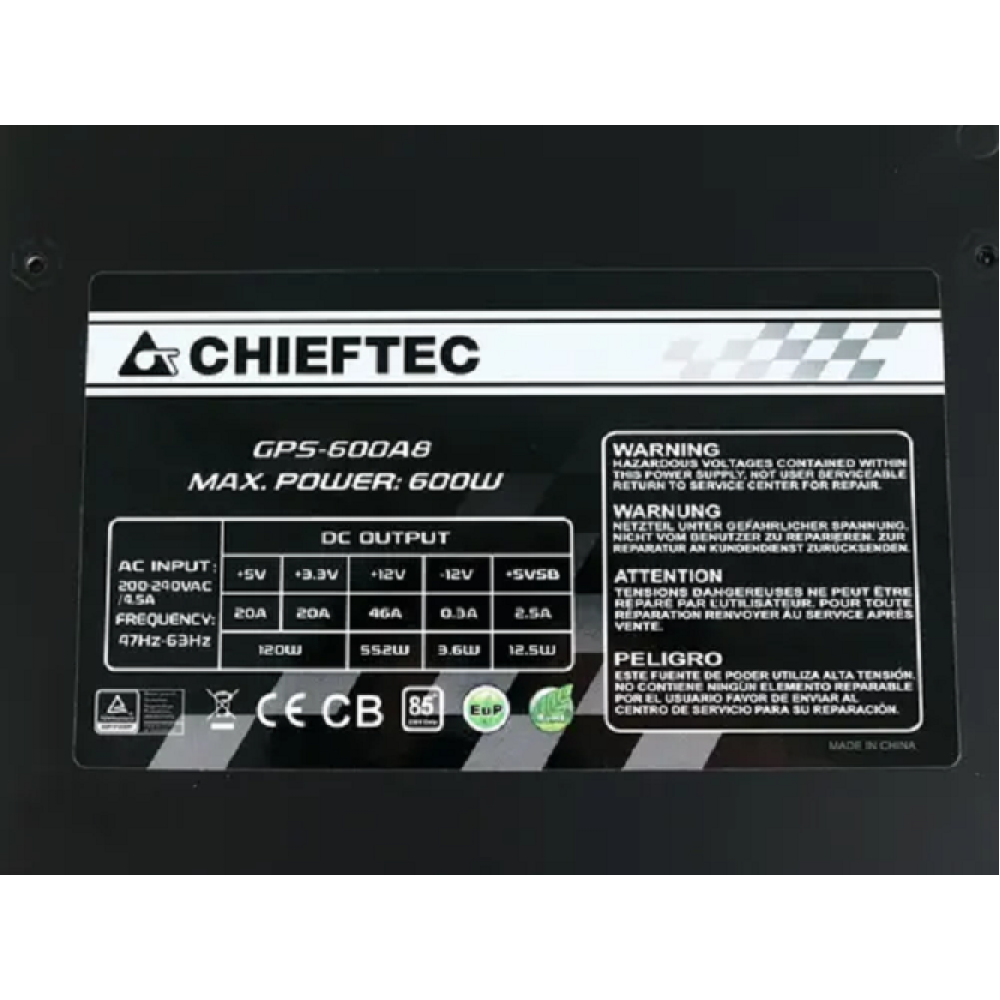 Блок питания Chieftec Smart Series 600W [GPS-600A8] обладает высокопроизводительной аппаратной основой, выдающей мощность 600 Вт, чего хватит для питания комплектующего оборудования как офисной, так и игровой компьютерной машины. Типоразмер ATX, представленный габаритами 140x150x86 мм, подарил представленной модели широкий круг ПК, в системных блоках которых она может быть использована. Активный тип коррекции коэффициента мощности позволит данному оборудованию без труда справиться с пониженным напряжением в электросети.