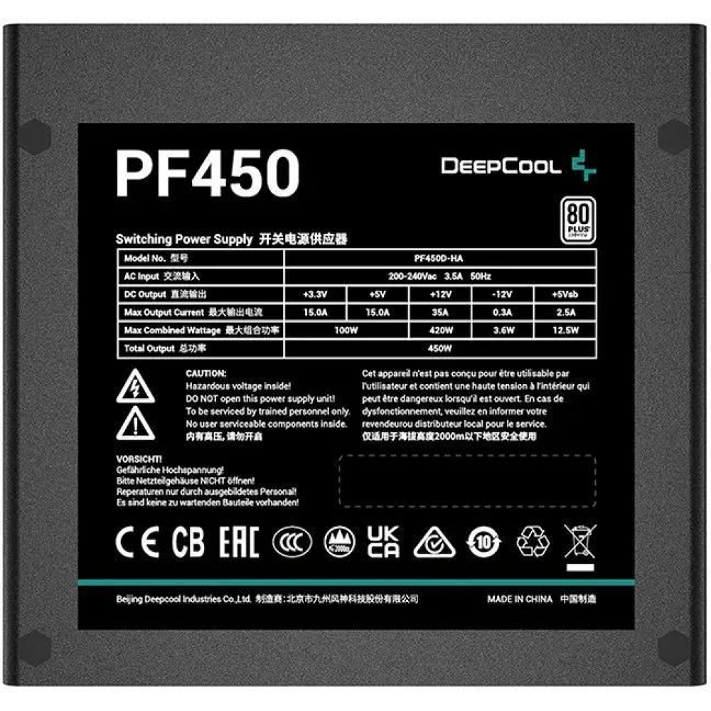 Блок питания DEEPCOOL PF450 [R-PF450D-HA0B-EU] с суммарной выходной мощностью по всем линиям 450 Вт может быть использован для питания компьютерной сборки, рассчитанной на работу с мультимедиа и офисным софтом. БП оснащается кабелями с основным разъемом питания 20 + 4 pin и разъемами для подключения ЦПУ, интерфейсами для питания SATA-накопителей (до 6 шт) и видеокарт (до 2 шт). Устройство поставляется вместе с сетевым шнуром и поддерживает работу при уровне входного напряжения 200-240 В.