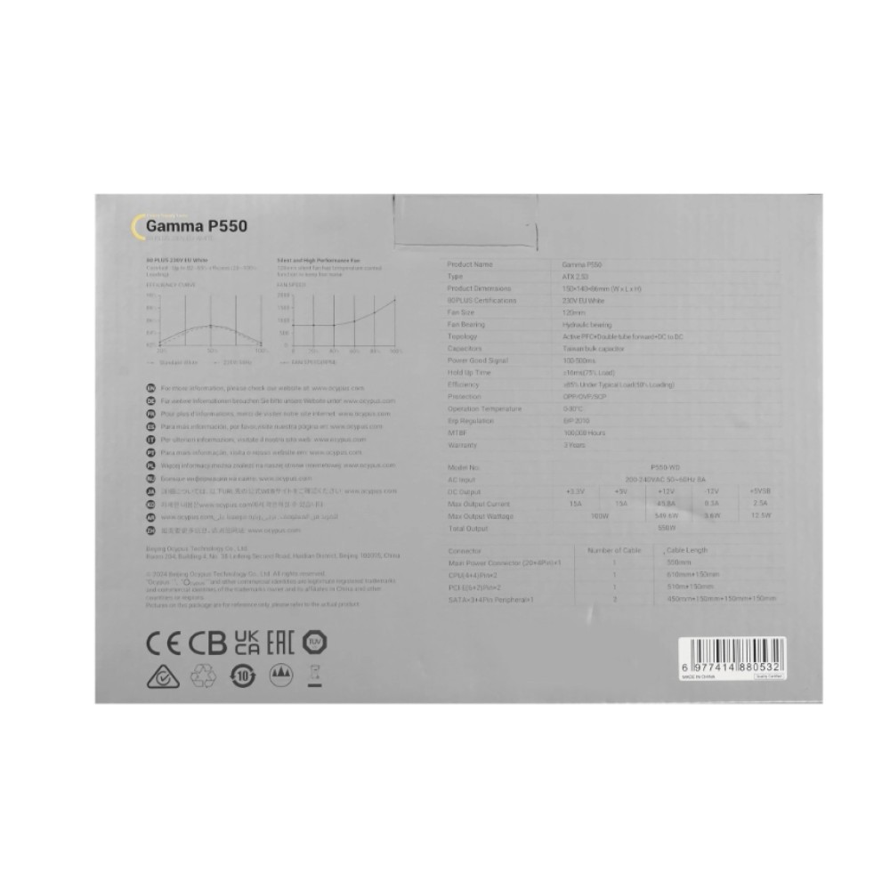Блок питания Oсypus Gamma P550 – устройство с общей максимальной мощностью 550 Ватт, предназначенное для обеспечения стабильной работы в компьютерах, не предъявляющих повышенных требований к источнику, например, в офисных ПК, рабочих станциях начального уровня.