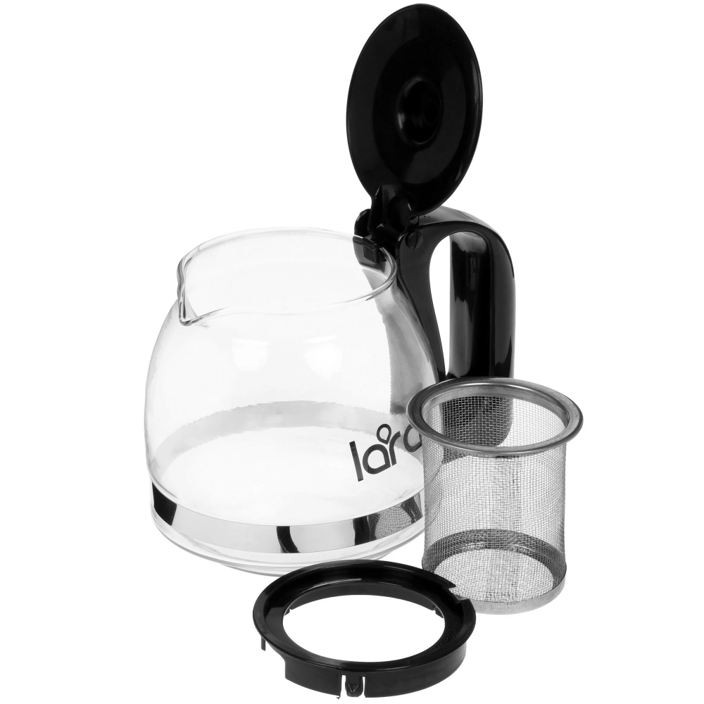 Экологически чистые материалы, использованные при изготовлении чайника Lara LR06-07, позволяют безопасно и комфортно им пользоваться. Изготовлен прибор из стекла, прочного пластика, позволяющего легко брать чайник за ручку. Хромированная отделка модели способствует обретению прочности конструкции. Съемный фильтр сделан из нержавеющей стали, что делает его долговечным элементом. Мелкие дырочки не допускают проникания в емкость чайника мелких чаинок, поэтому ваш напиток не будет содержать примесей и вы сможете наслаждаться чистым, вкусным и ароматным напитком.