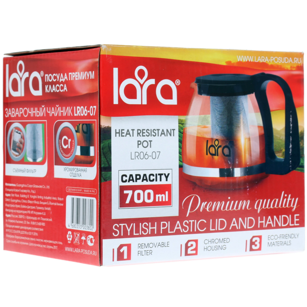 Чайник заварочный Lara LR06-07 выполнен в прозрачном корпусе и предусматривает ручку и крышку в черном цвете. Благодаря использованию жаропрочного стекла для изготовления корпуса вы получаете возможность контролировать количество жидкости, а также цвет напитка. Емкость чайника рассчитана на 0.7 литров, что позволяет наполнить чашки всем, кто хочет отведать горячего напитка.