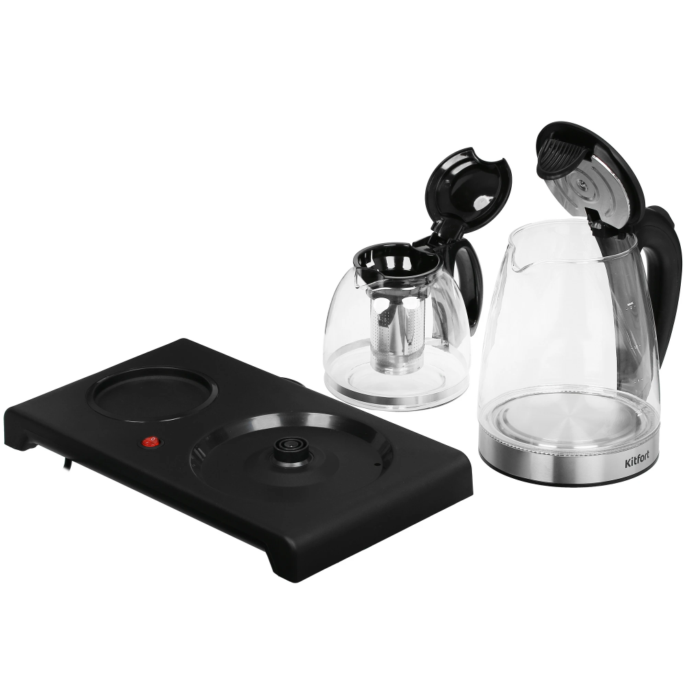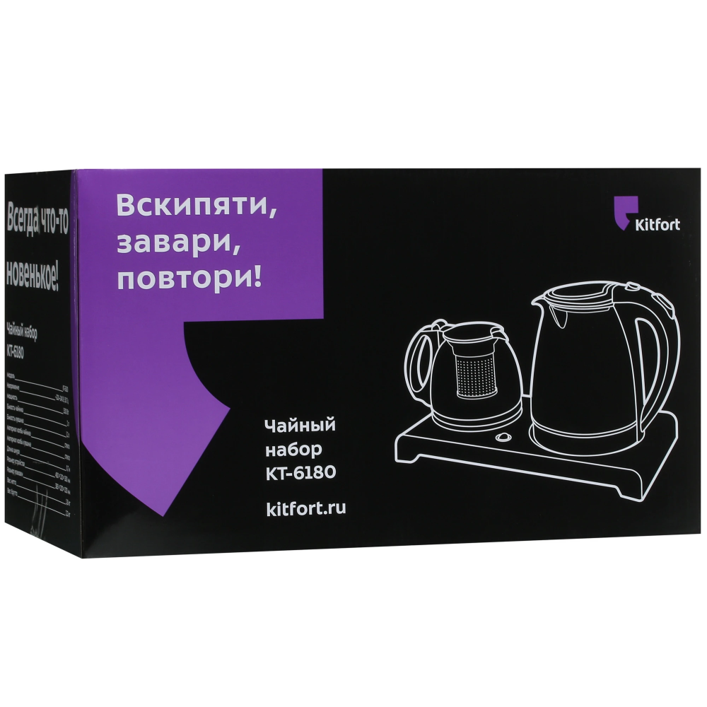 Чайный набор Kitfort КТ-6180 комплектуется подставкой со скрытым нагревательным элементом, который предупреждает быстрое остывание воды. В комплект входит кувшин объемом 1.2 л и чайник объемом 2 л. Расположенный в резервуаре фильтр задерживает частицы накипи и заварки.