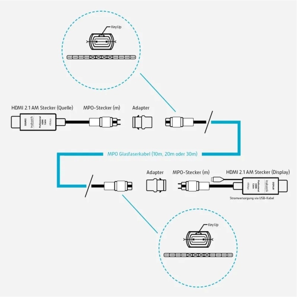 Гибкое направление: адаптеры HDMI-MPO можно менять местами, чтобы изменить направление кабеля. Это значительно повышает гибкость установки и позволяет оптимально адаптироваться к различным условиям помещения.