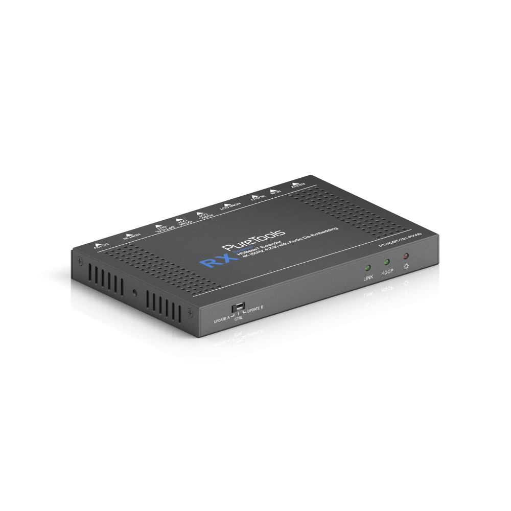 PT-HDBT-701-RXAD — комплект передатчика и приемника сигнала HDMI, передатчик имеет удобное соединение для возврата звука через HDMI-ARC, оптическое или двухканальное стерео. На приемнике также доступны управление через двухканальные ИК-порт, RS232 и два порта данных 10/100 LAN. Compression Point Compression позволяет передавать контент 18 Гбит / с с использованием технологии HDBaseT 2.0 без ощутимой разницы в качестве видео.