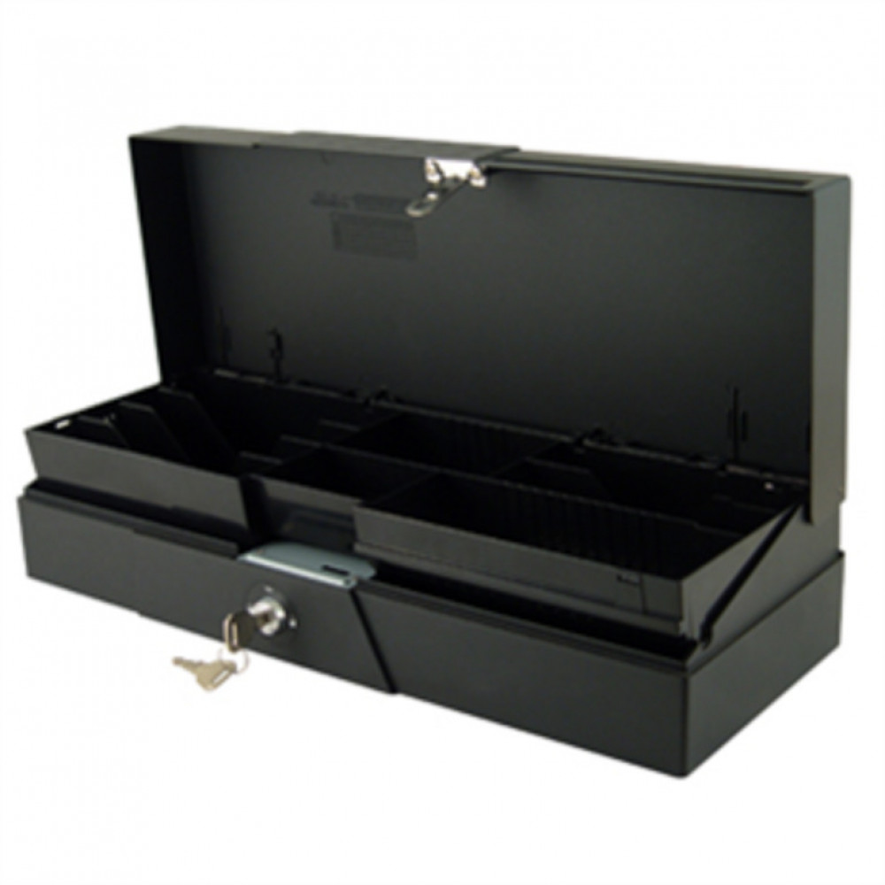 Денежный ящик Posiflex CR-2200 Flip-top, как понятно даже из названия, имеет крышку, открывающуюся вверх. Ящик сделан из алюминиевого сплава и заключен в стальной корпус без винтов — то есть вскрыть его незаметно нельзя. Для CR-2200 используется особый трехпозиционный ключ, а электронный механизм ящика позволяет выдержать более миллиона открываний, причем крепления не разболтаются. В денежном ящике CR-2200 есть 6 секций для купюр, 8 секций для монет (допустимо изменять число и размер секций передвижными перегородками), а также секретная ячейка для крупных купюр и документов. Подключать аппарат можно через интерфейс принтера, USB 1.1 или RS-232. Денежный ящик небольшого размера, так что его легко установить там, где мало места.
