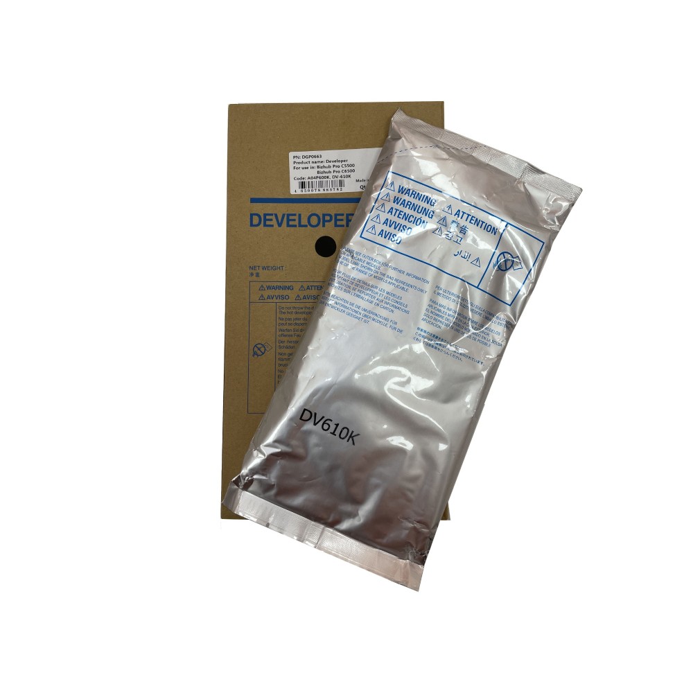 Девелопер CET DGP0663 (DV-610K) Black — совместимый расходный материал для профессиональных цветных печатных систем Konica Minolta Bizhub PRO C5500, C5501 и C6000. Используется в блоке проявки чёрного цвета и обеспечивает корректное притяжение тонера к фотобарабану, формируя стабильное и чёткое изображение с высокой плотностью чёрного.