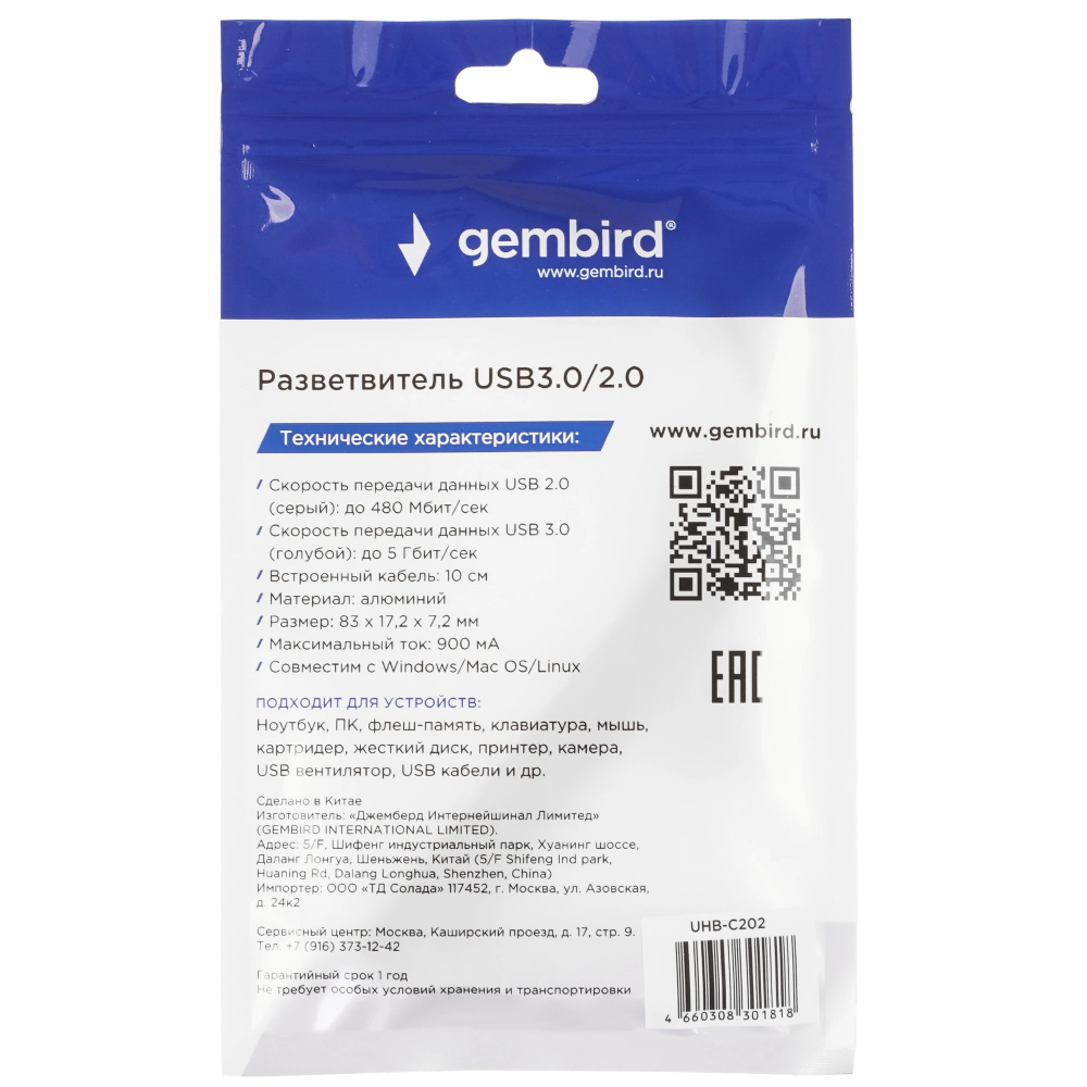 USB-разветвитель Gembird UHB-C202 с одним портом USB 3.0 и тремя портами USB2.0 выполнен в компактном алюминиевом корпусе.