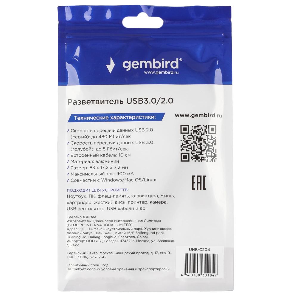 USB-разветвитель Gembird UHB-C204 с одним портом USB 3.0 и тремя портами USB2.0 выполнен в компактном алюминиевом корпусе.