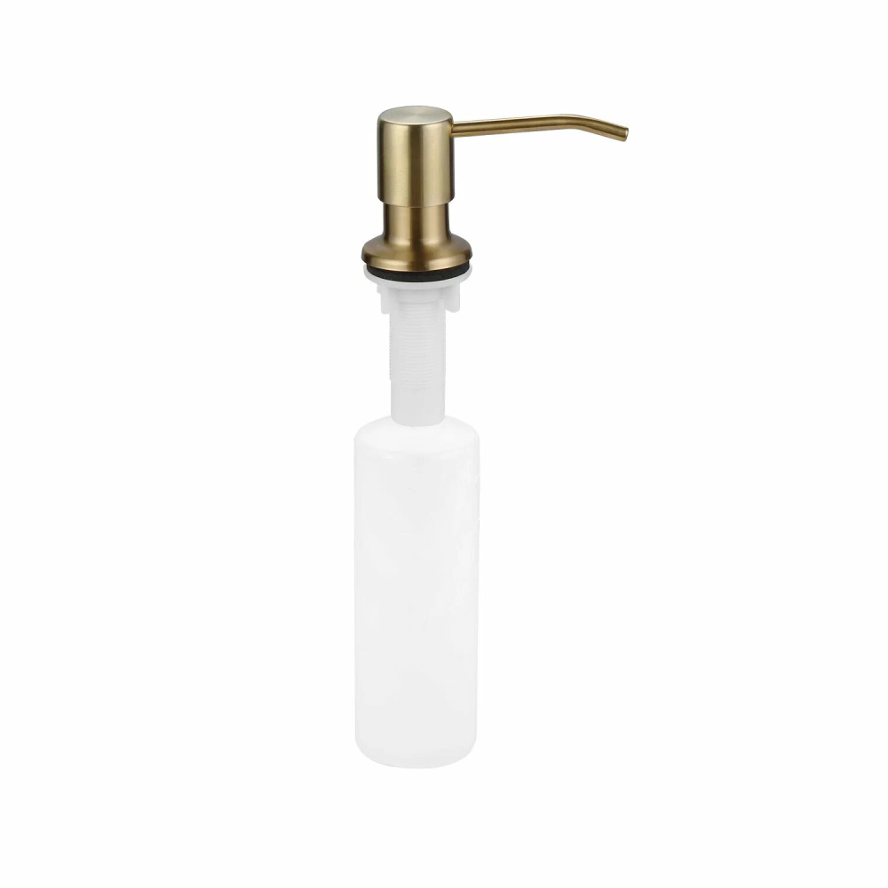 Встраиваемый дозатор для жидкого мыла или моющего средства. Устанавливается в кухонную мойку. Корпус из нержавеющей стали и пластика, цвет — матовый сатин золото. Ёмкость 350 мл, верхняя заправка, в комплекте монтажный набор.