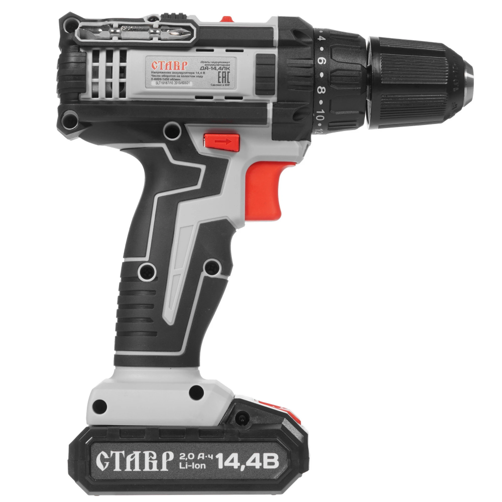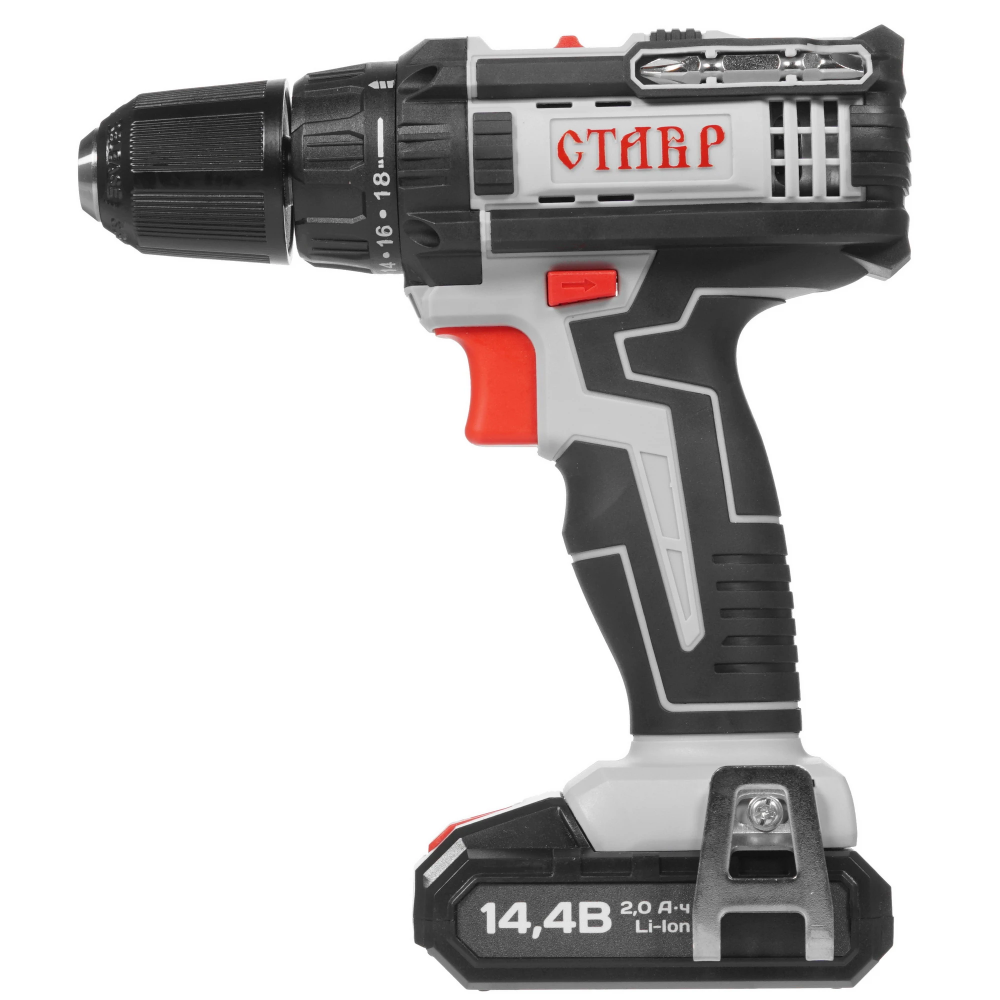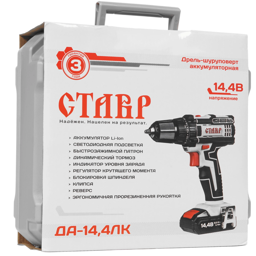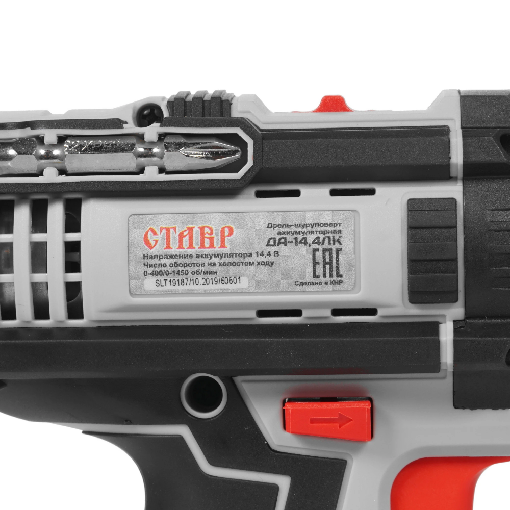 Безударная дрель-шуруповерт Ставр ДА-14.4ЛК оснащена прорезиненной рукояткой и специальным гнездом на корпусе для удобного крепления бит. Прибор с щеточным двигателем и быстрозажимным патроном допускает работу с оснасткой при диаметре зажима 0.8-10 мм. Устройство дополнено подсветкой, режимом сверления, реверсом и электронной защитой от перегрузок.