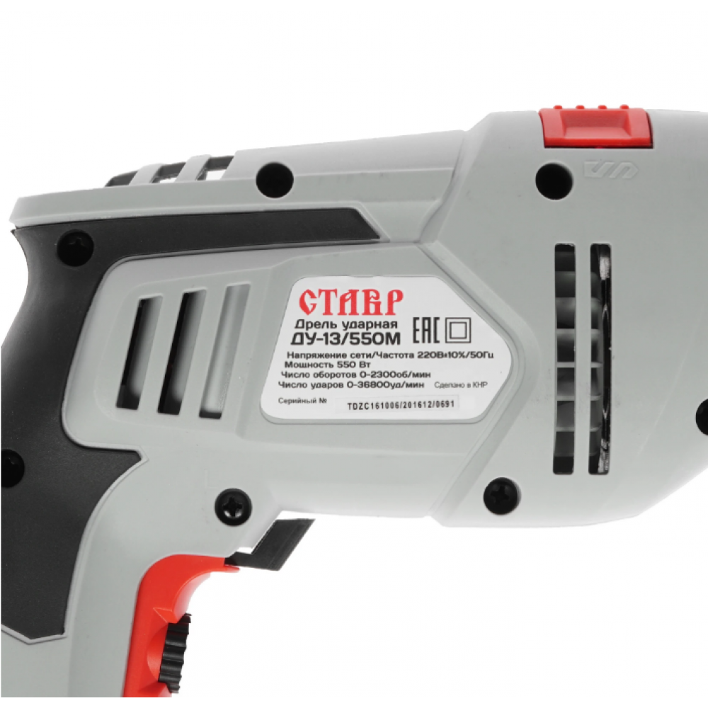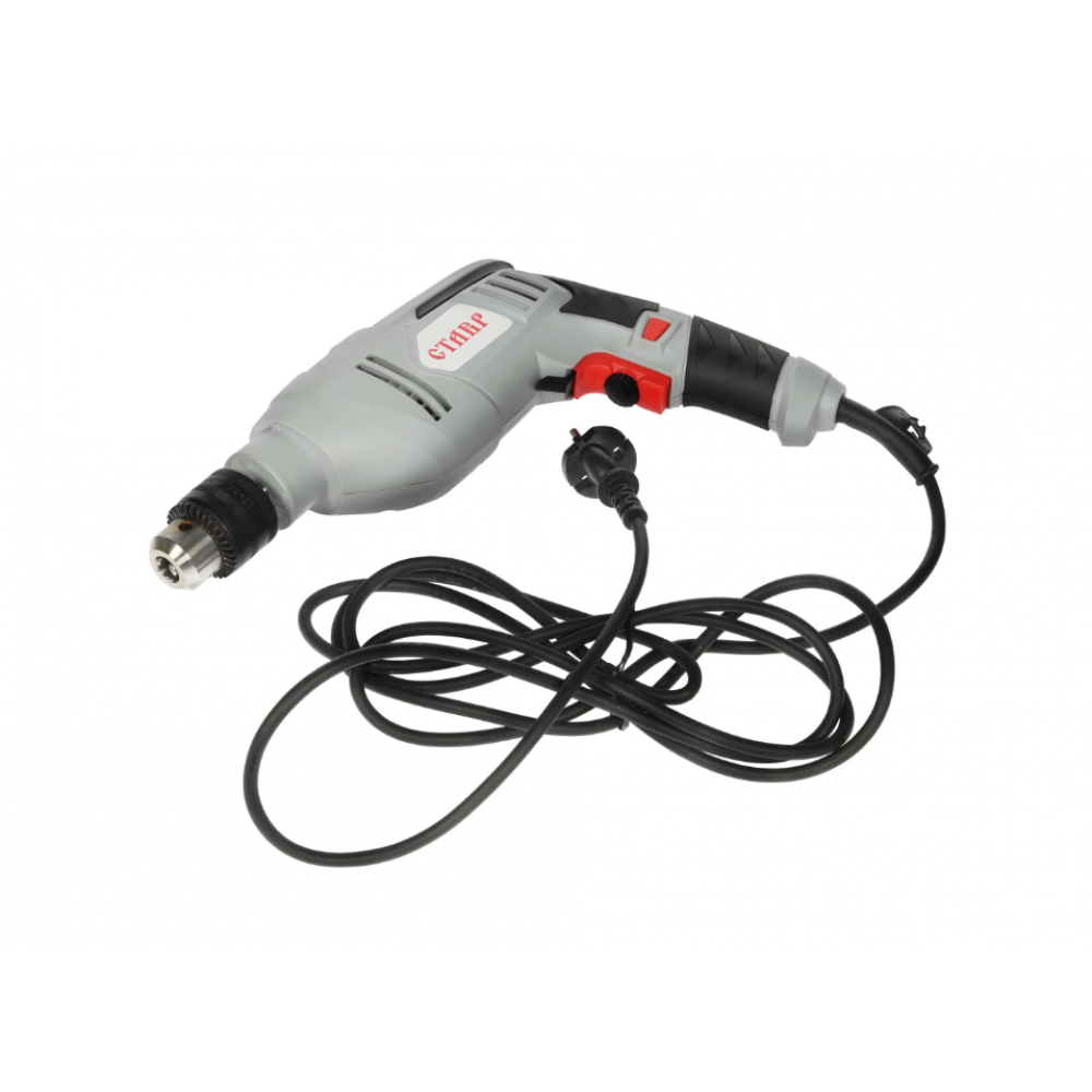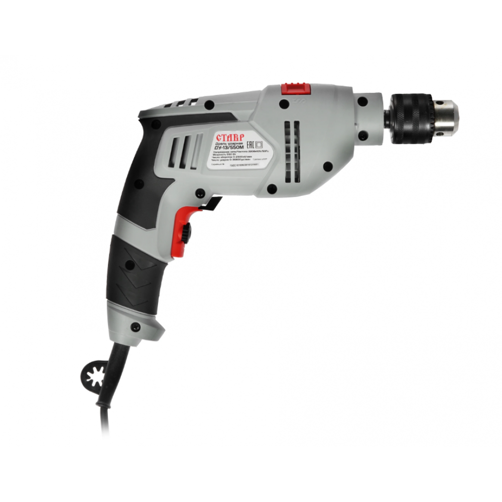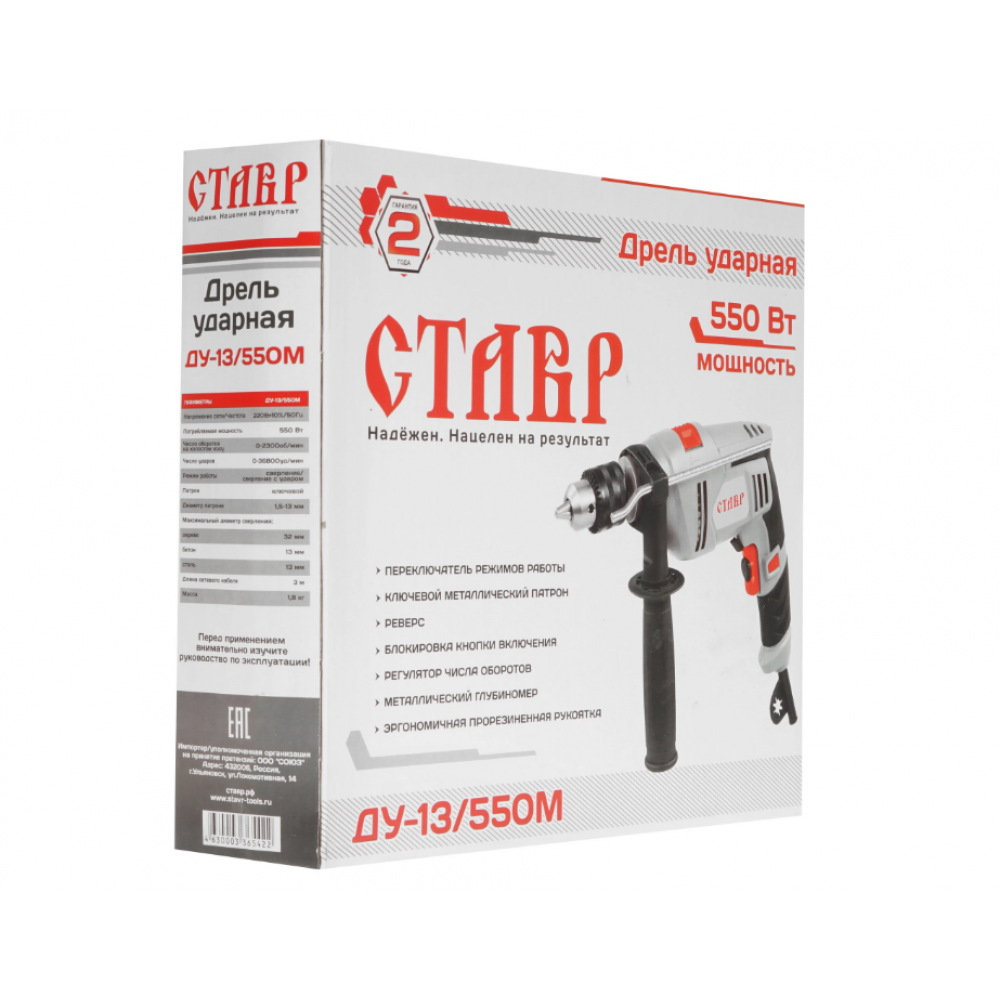 Дрель СТАВР ДУ-13/550 М - практичный инструмент бытового назначения, выполняющий сверление и рассверливание отверстий в металлах, древесных материалах, пластике. При подключении режима сверления с осевым ударом дрель может применяться для эффективного сверления минеральных стройматериалов, включая бетон, камень, кирпич. В редукторе дрели с мощностью электропривода 550 Вт имеется реверс, поэтому извлечение засевшего в материале сверла не потребует много усилий.