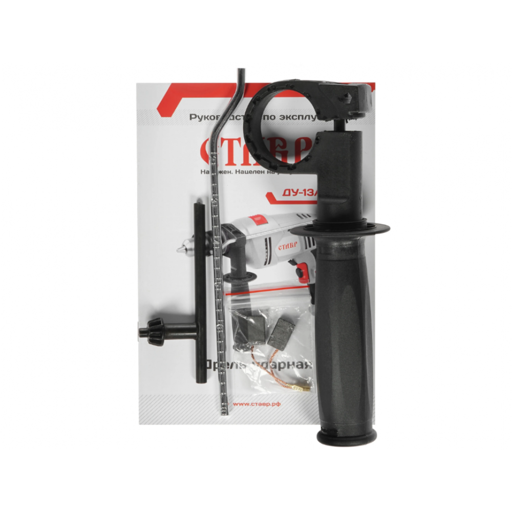 Дрель СТАВР ДУ-13/550 М комплектуется ключевым патроном с диаметром 1.5-13 мм, надежно фиксирующим любую используемую вами сверлильную оснастку. Фиксатор куркового выключателя дрели является полезной опцией: он обеспечивает удобство длительной непрерывной работы. Инструмент питается от сети 220 В, подключаясь к розетке посредством 3-метрового сетевого кабеля. Он предлагается вам вместе с ограничителем глубины сверления, дополнительной рукояткой, ключом для патрона, сменными угольными щетками для электродвигателя.