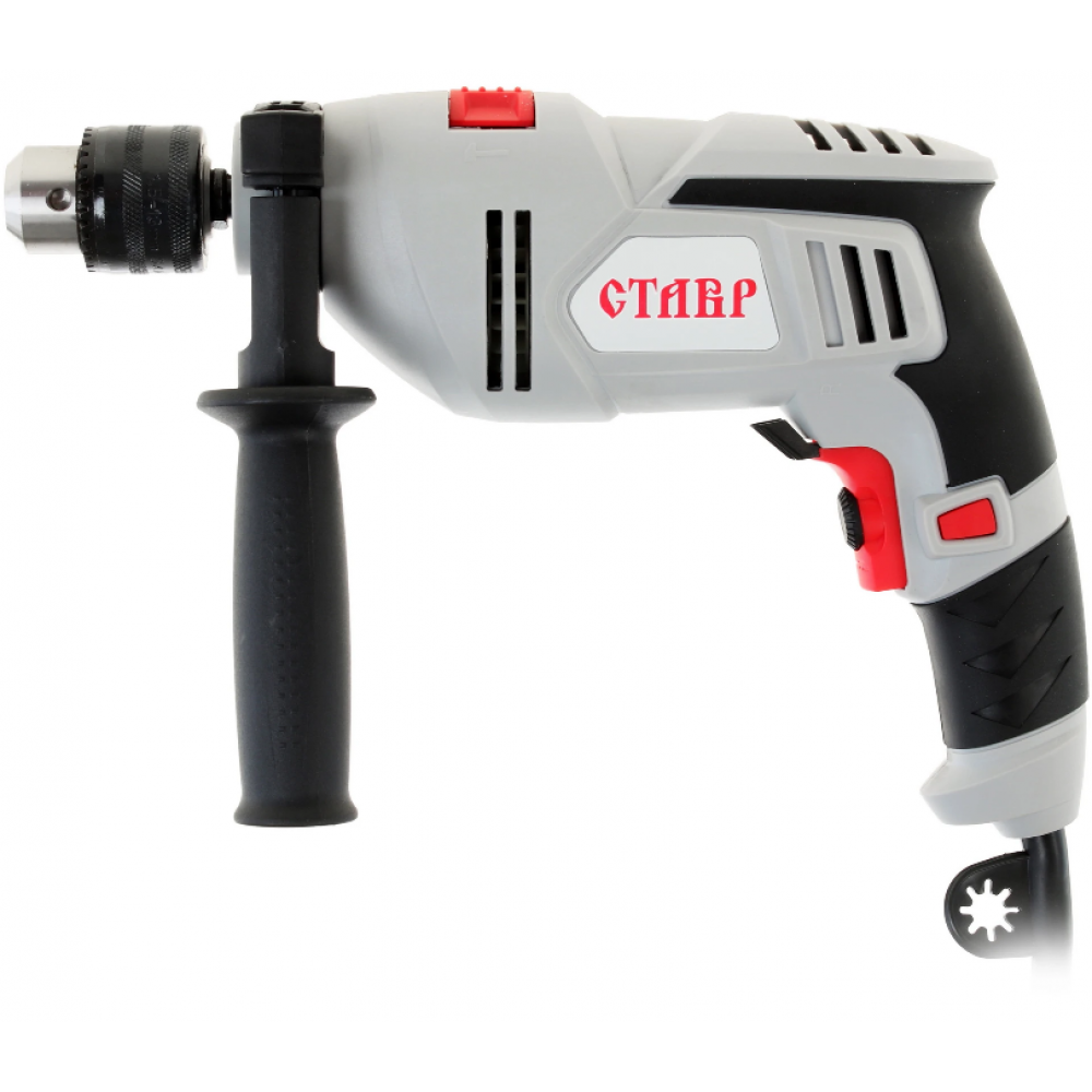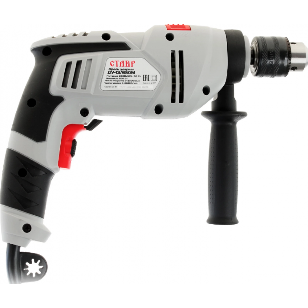 Дрель СТАВР ДУ-13/650М с мощностью электропривода 650 Вт уверенно проделывает отверстия в древесине, металле, бетоне, кирпичной кладке. Дрель снабжена ключевым патроном для монтажа оснастки, который предполагает установку сверл диаметром 1.5 - 13 мм для сверления дерева на глубину до 32 мм, металла и бетона, кирпича - до 13 мм. Инструмент может действовать в режиме сверления с ударом и дает возможность работать с твердыми и сыпучими материалами.