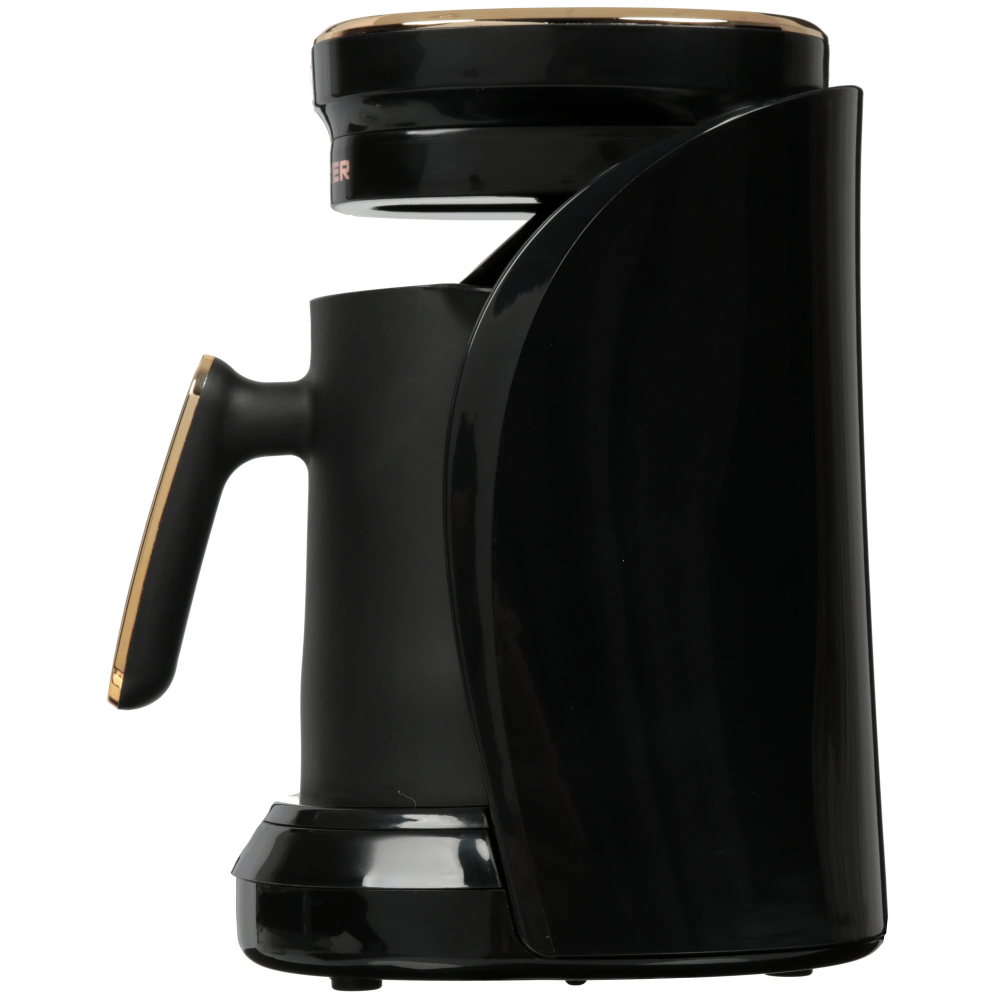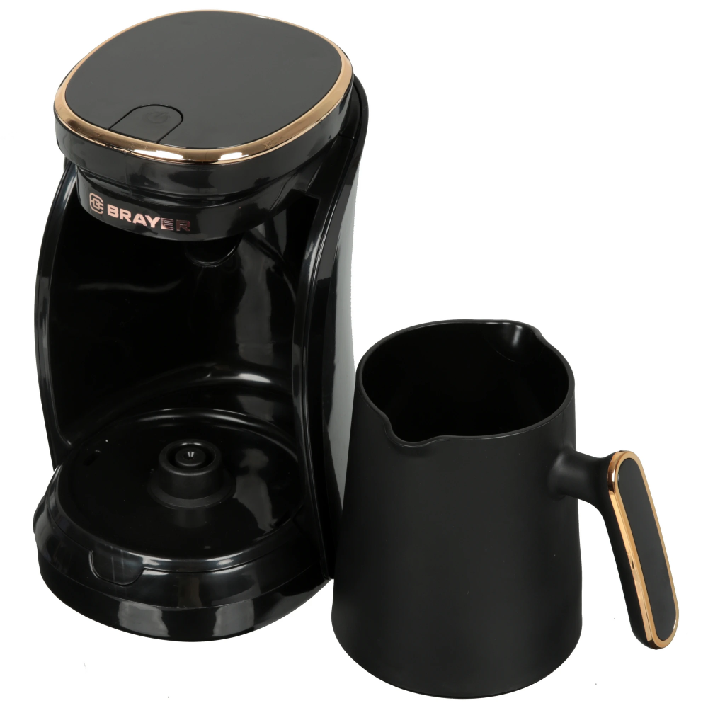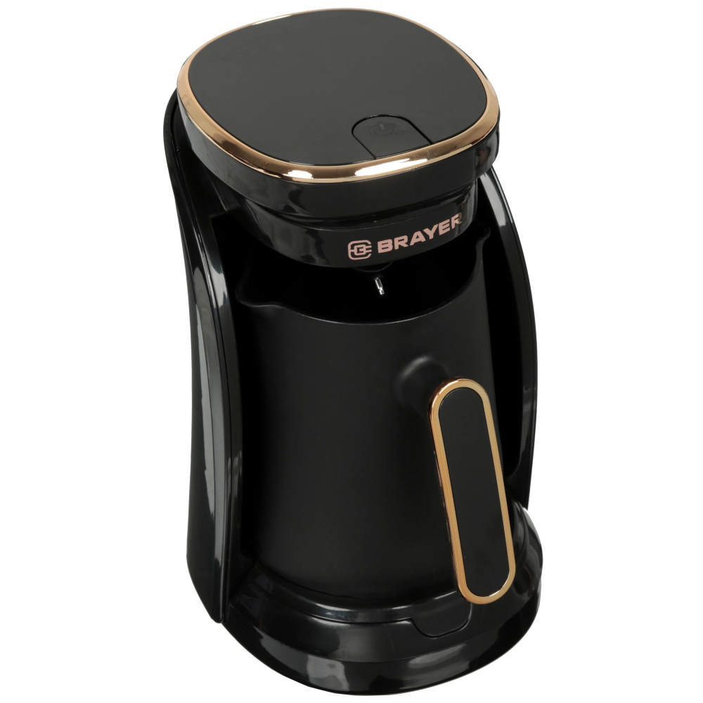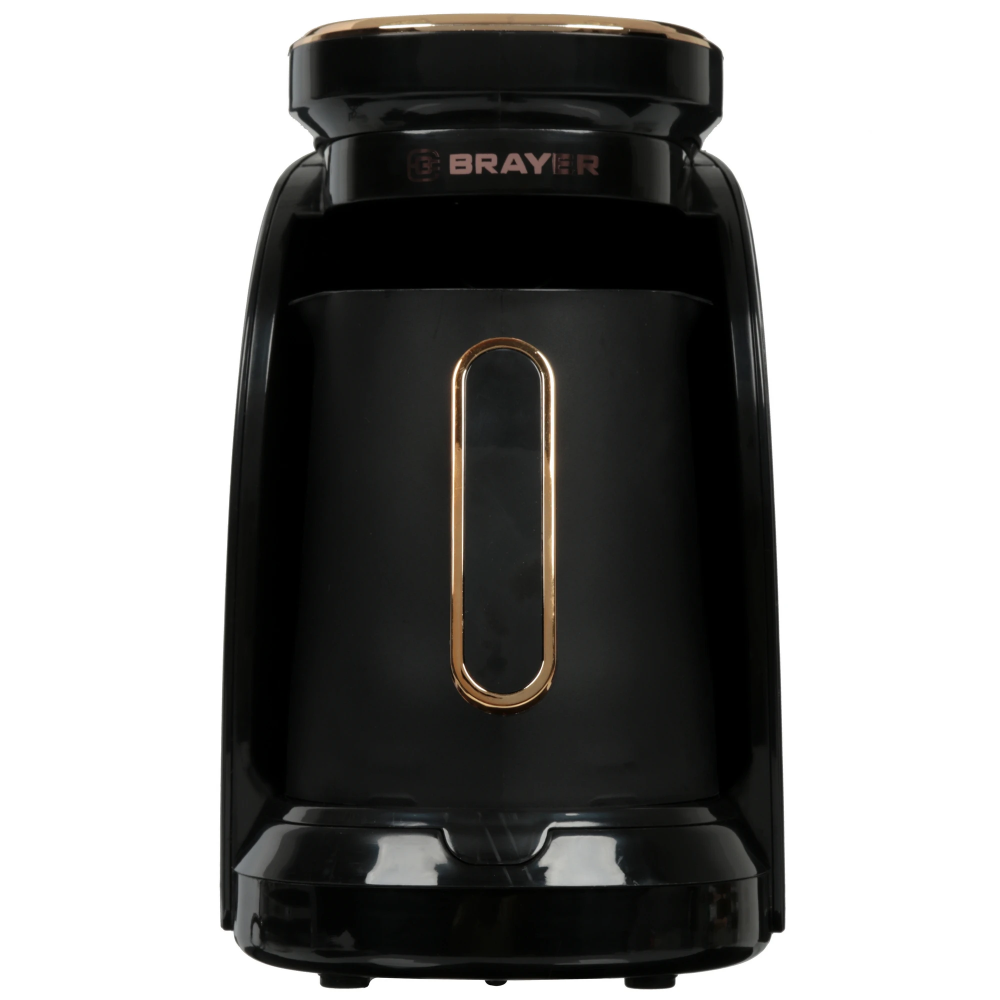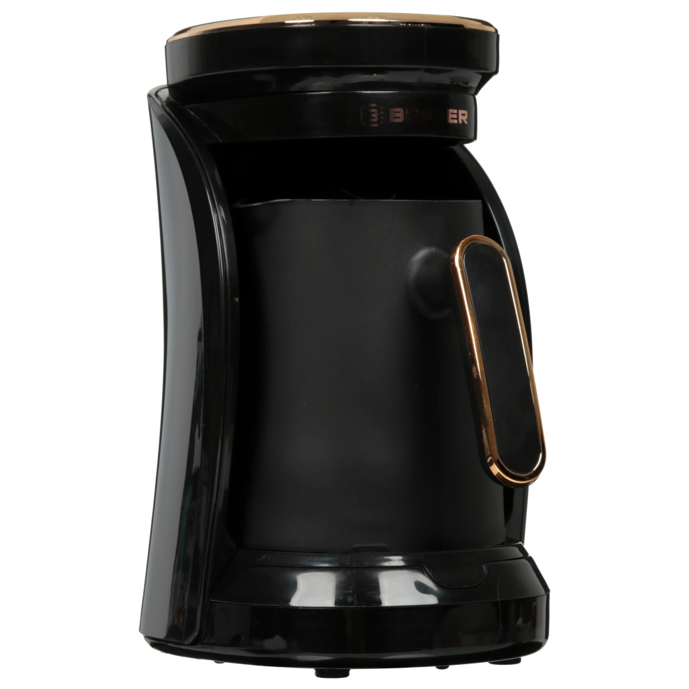 Кофеварка-турка BR1143 сварит бодрящий напиток за 3 минуты благодаря мощности 500 Вт. Чаша выполнена из высокопрочного пластика. Объема 0,5 л хватит на 2 чашки кофе. В кофеварке установлен датчик, который отключает кофеварку при нагреве воды до 98°. Кроме того, кофеварка оснащена световой и звуковой индикацией, которая сигнализирует об окончании процесса приготовления кофе.