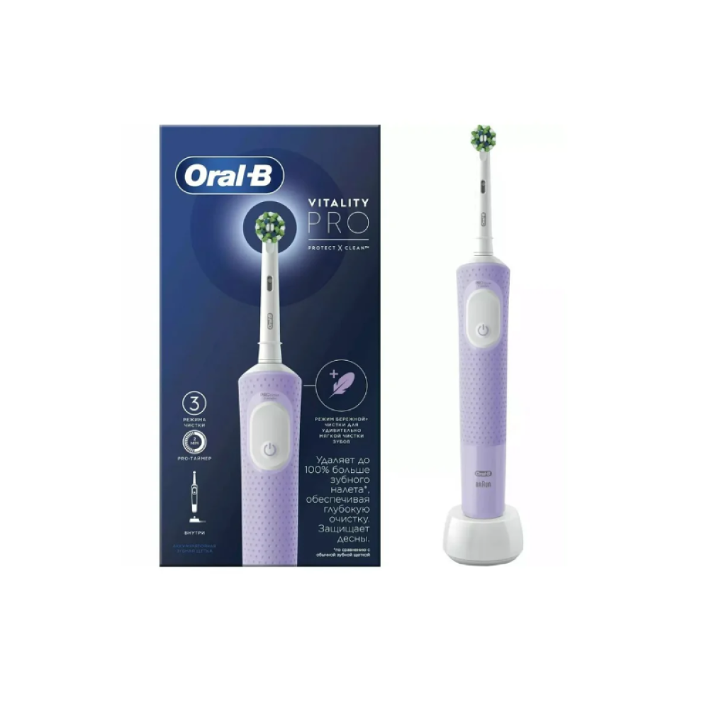 В наборе лиловая щетка Oral-B Vitality Pro и 2 сменные насадки.