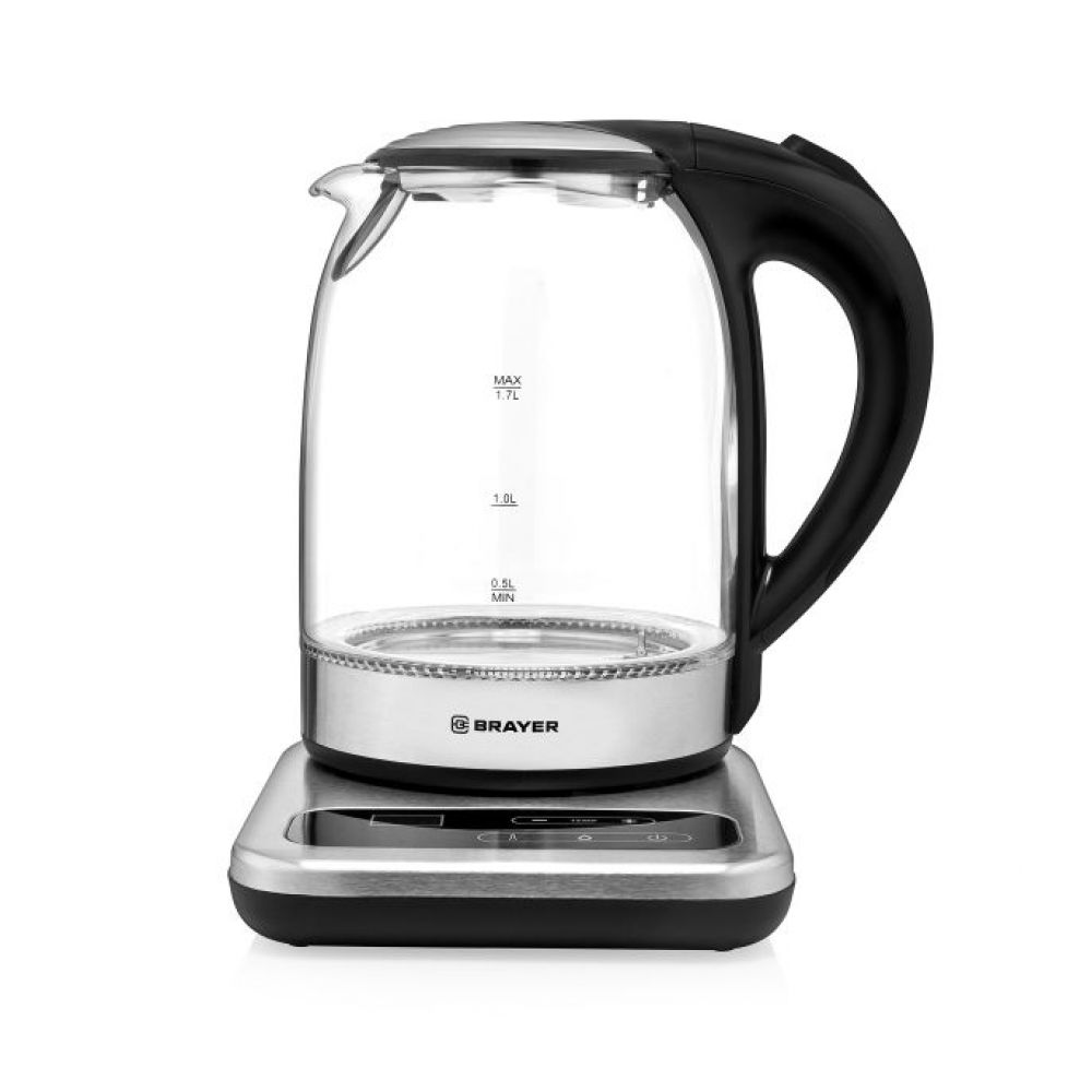 Электрочайник Brayer BR1003 представлен в прочном черном корпусе с резервуаром на 1.7 л из термостойкого стекла. Оборудование оснащено скрытым нагревательным элементом, гарантирующим быстрое кипячение воды. Конструкция дополнена нейлоновым фильтром в носике. Устройство оснащено подставкой с электронным управлением и системой автоотключения.