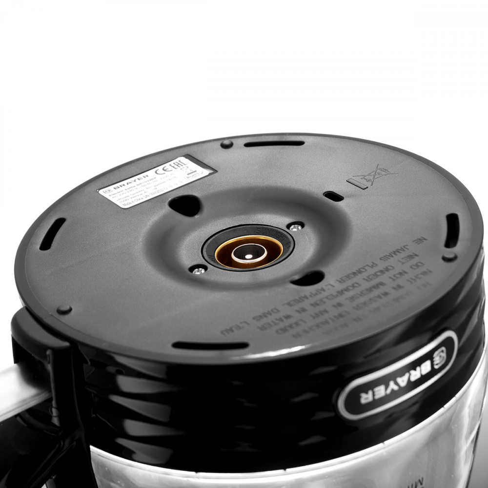 В носике чайника BRAYER BR1029BK спрятан фильтр, поэтому в чашку будет литься только чистая вода без частичек накипи. Безопасную эксплуатацию обеспечивает автоматическое отключение прибора при закипании воды, а также при включении без воды. Это предотвращает поломку чайника. Полностью съемная крышка облегчает процесс очистки устройства. Особенность прибора во встроенной голубой подсветке, которая срабатывает при включении электрочайника.