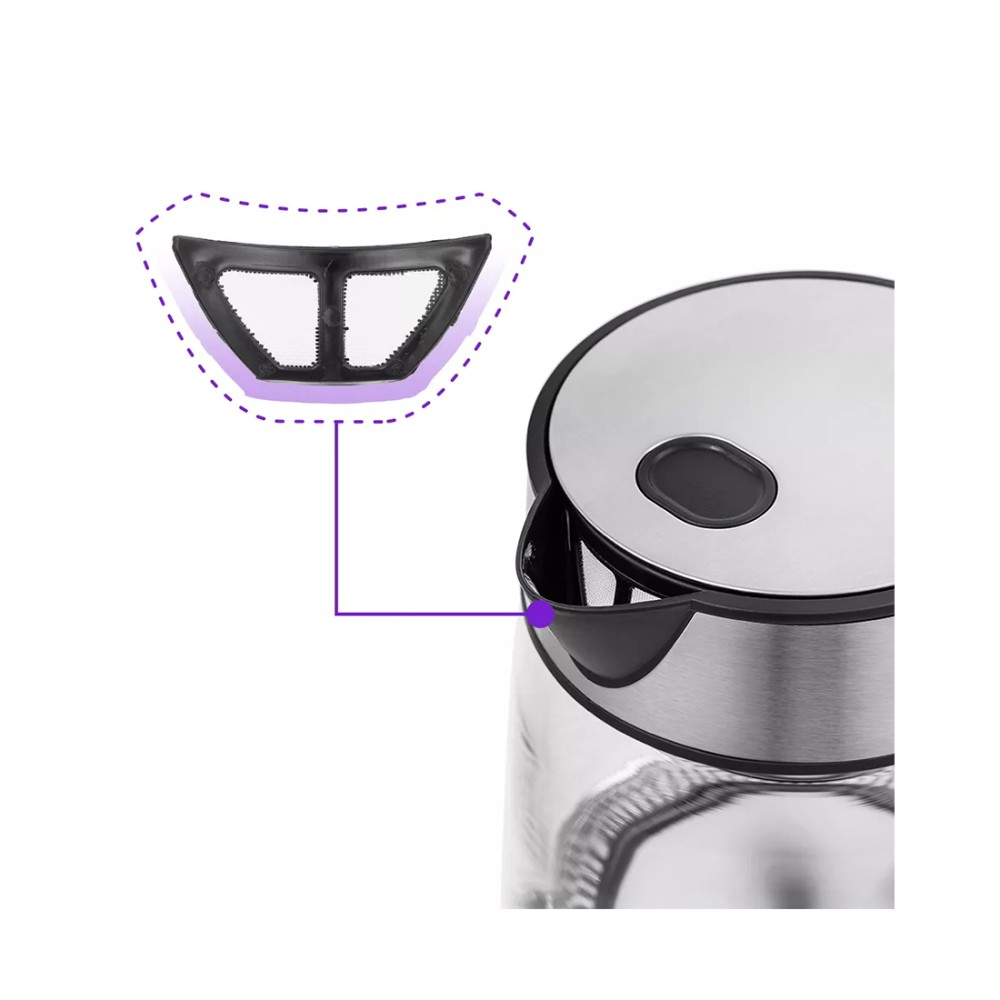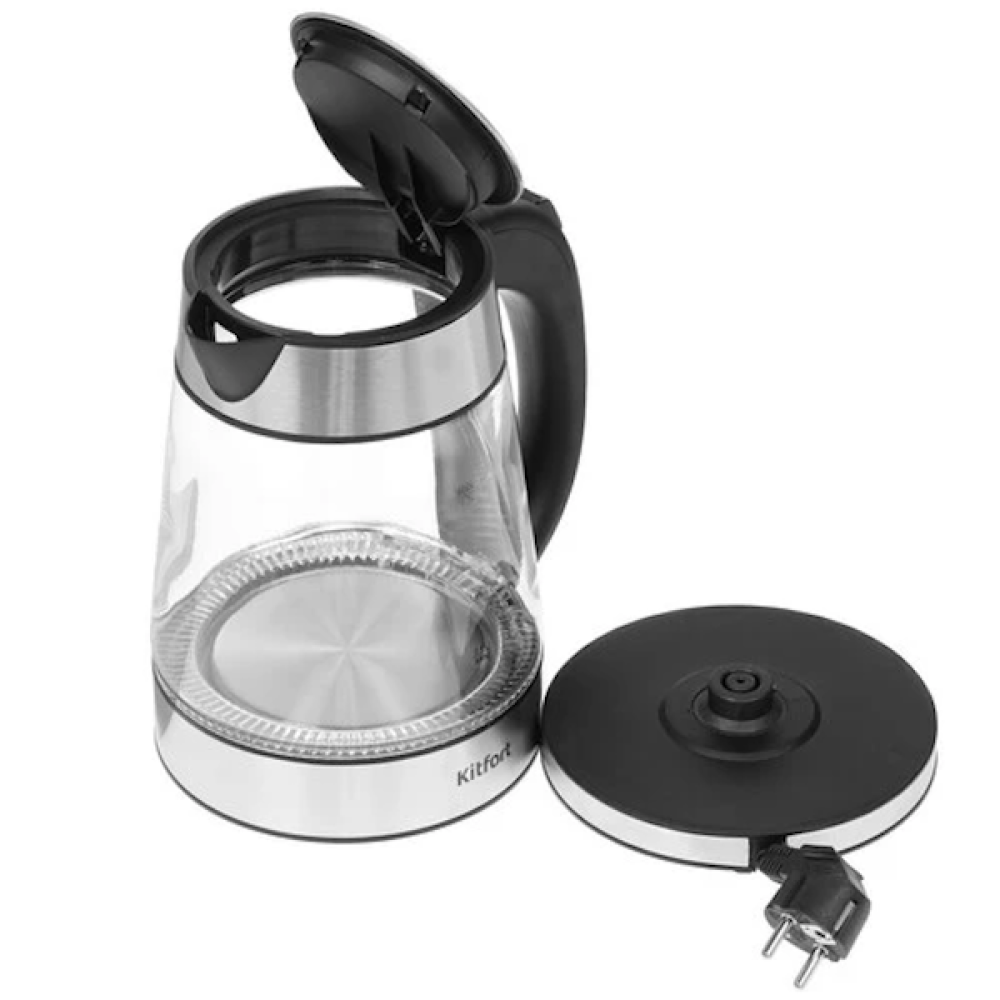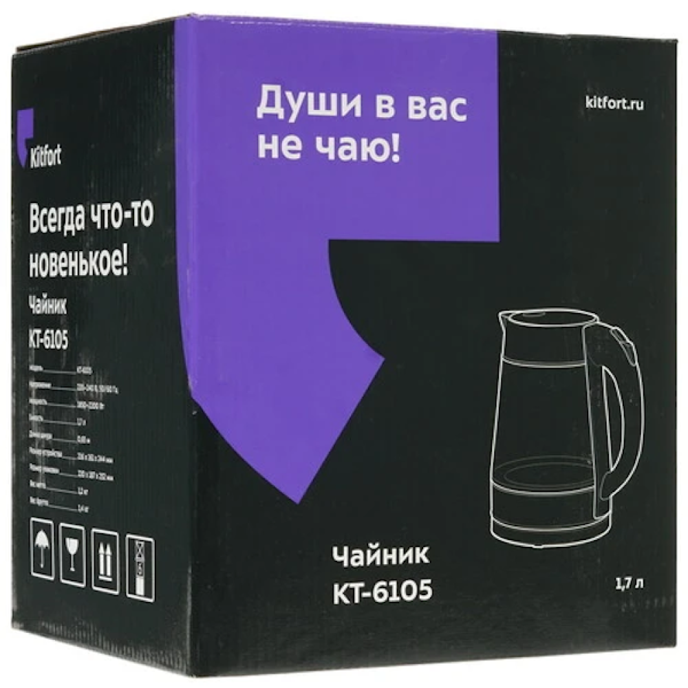 В чайнике реализована яркая разноцветная подсветка (зеленый, голубой, красный, желтый), которая активируется при включении. Подставка с вращением на 360 градусов, откидная крышка с защелкой и мерная шкала повышают комфорт в эксплуатации Kitfort KT-6105. А для обеспечения безопасности установлен контроллер Strix с технологиями автоматического отключения при закипании, блокировки от включения при малом количестве воды и защиты от перегрева.