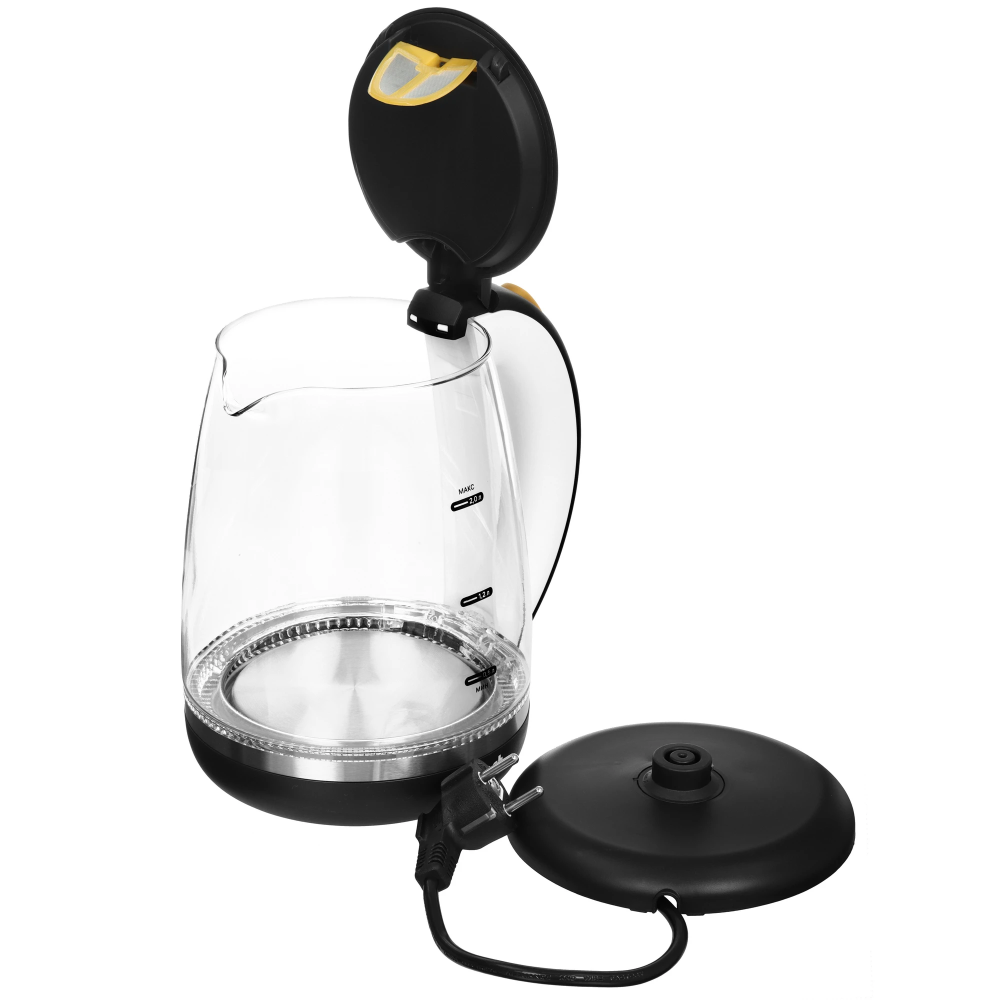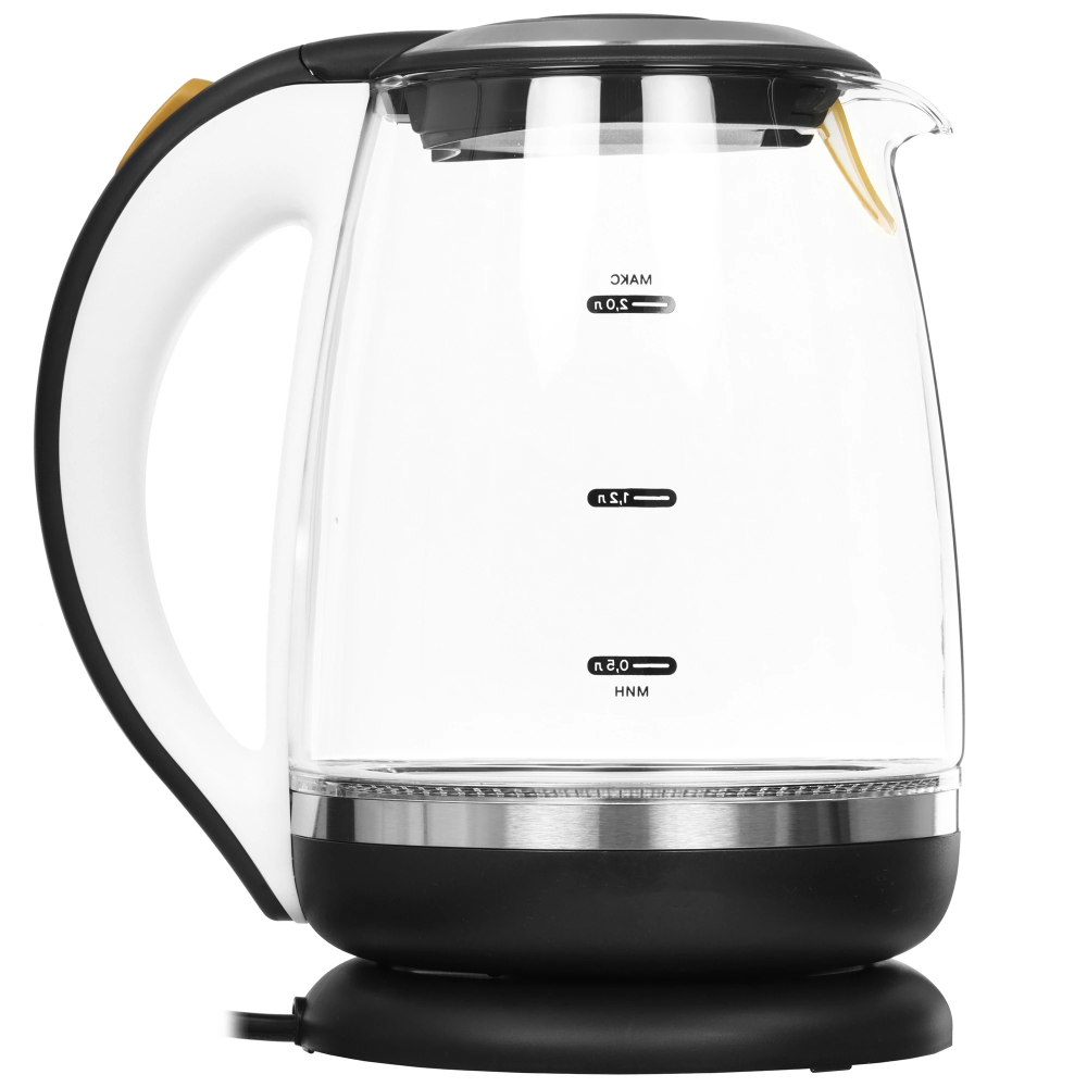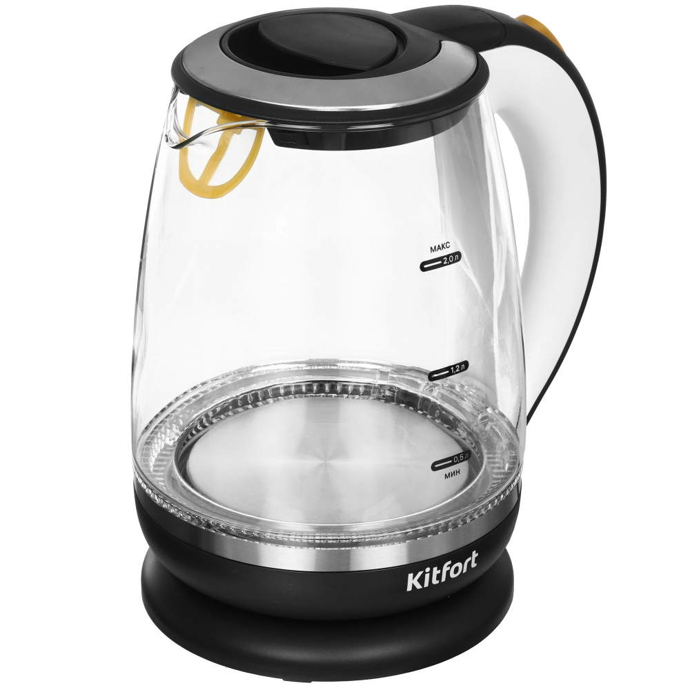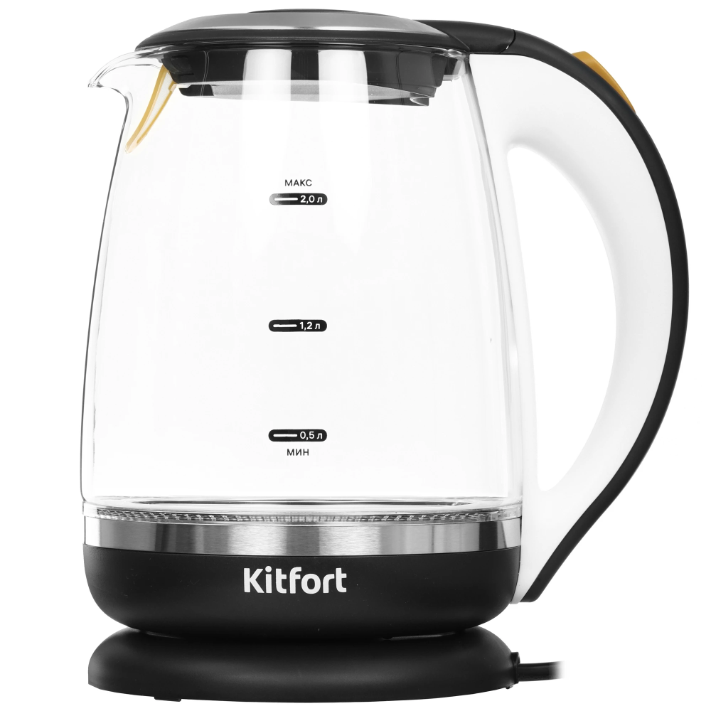 Электрический чайник Kitfort KT-6199 предназначен для быстрого кипячения воды дома, в офисе или на даче. Нагревательный элемент спрятан под металлической пластиной из нержавеющей стали. Это облегчает его очистку и значительно снижает шум при кипячении воды. На внешней стороне чайника расположена мерная шкала, рассчитанная на объем до 2 л. На верхней крышке имеется кнопка открытия. Прибор имеет защиту от перегрева, которая предотвращает включение прибора без воды. В носике чайника имеется съемный фильтр, который улавливает частицы накипи и предотвращает их попадание в чашку. При включении чайника белая подсветка по периметру дна сигнализирует о его рабочем состоянии, а также красиво подсвечивает воду. Подставка с центральным контактом позволяет разместить чайник в любом положении на 360°. Снизу имеется отсек для хранения шнура, в который можно смотать излишки шнура электропитания, чтобы он не мешал на столе.